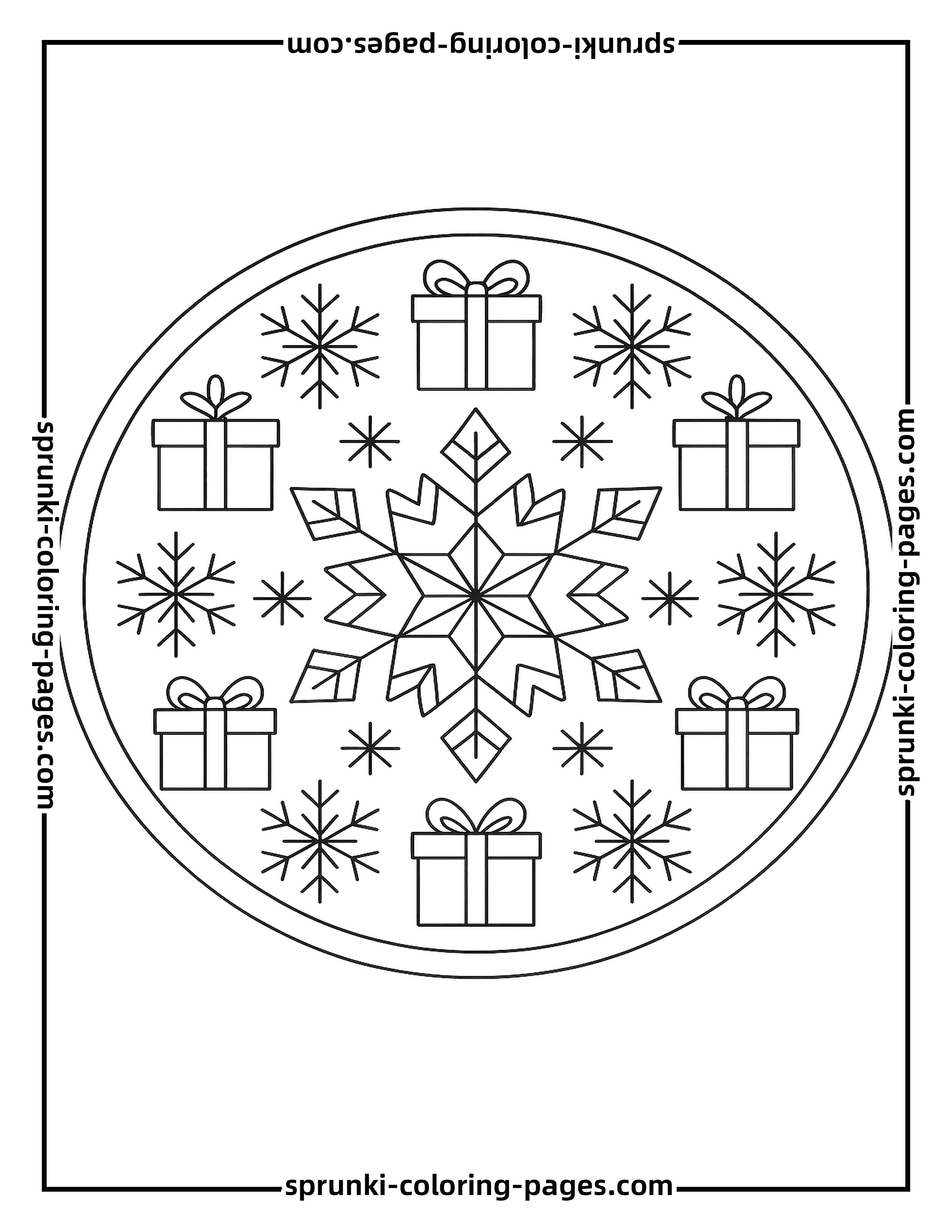 This Abstract Christmas Mandala Coloring Page for Adults showcases geometric snowflakes and gift box patterns, merging modern style with traditional holiday charm. Perfect for adult coloring fans who enjoy artistic symmetry. Explore more printable art on christmas coloring pages to elevate your collection.