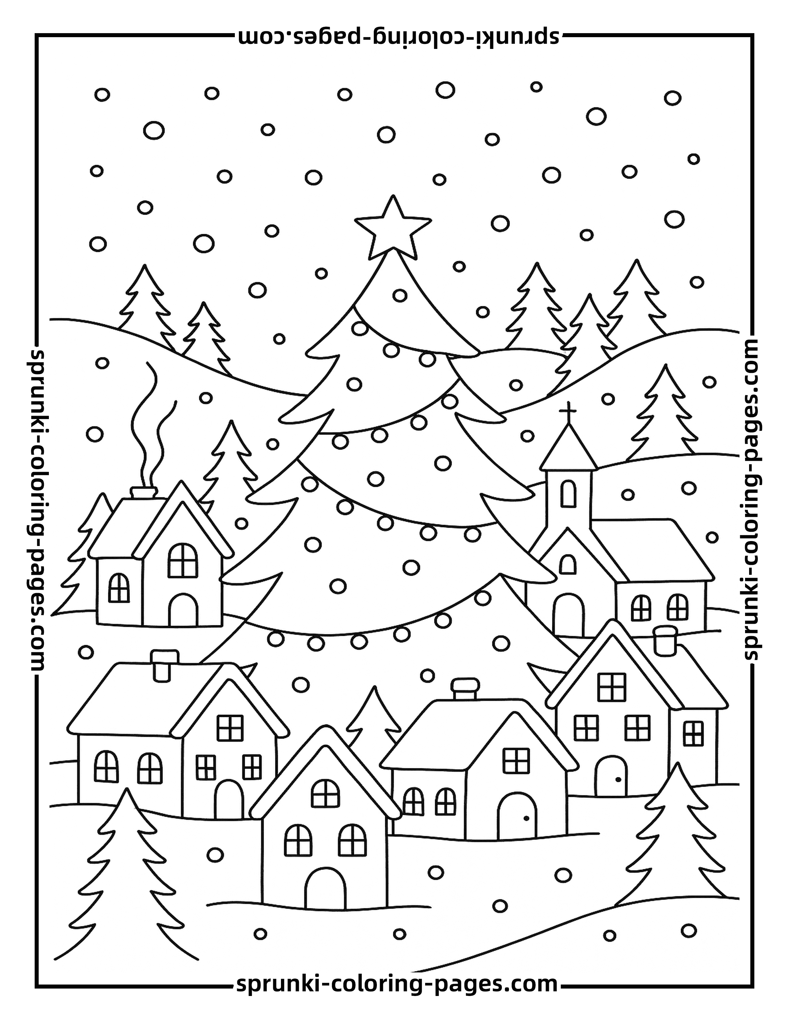 This alpine village Christmas tree coloring page shows a huge decorated tree under gentle snowfall with twinkling lights on cozy alpine homes. Ideal for kids and adults who love relaxing holiday coloring, it captures the serene beauty of winter. Discover more creative designs in our christmas coloring pages collection and a variety of Christmas tree coloring pages.