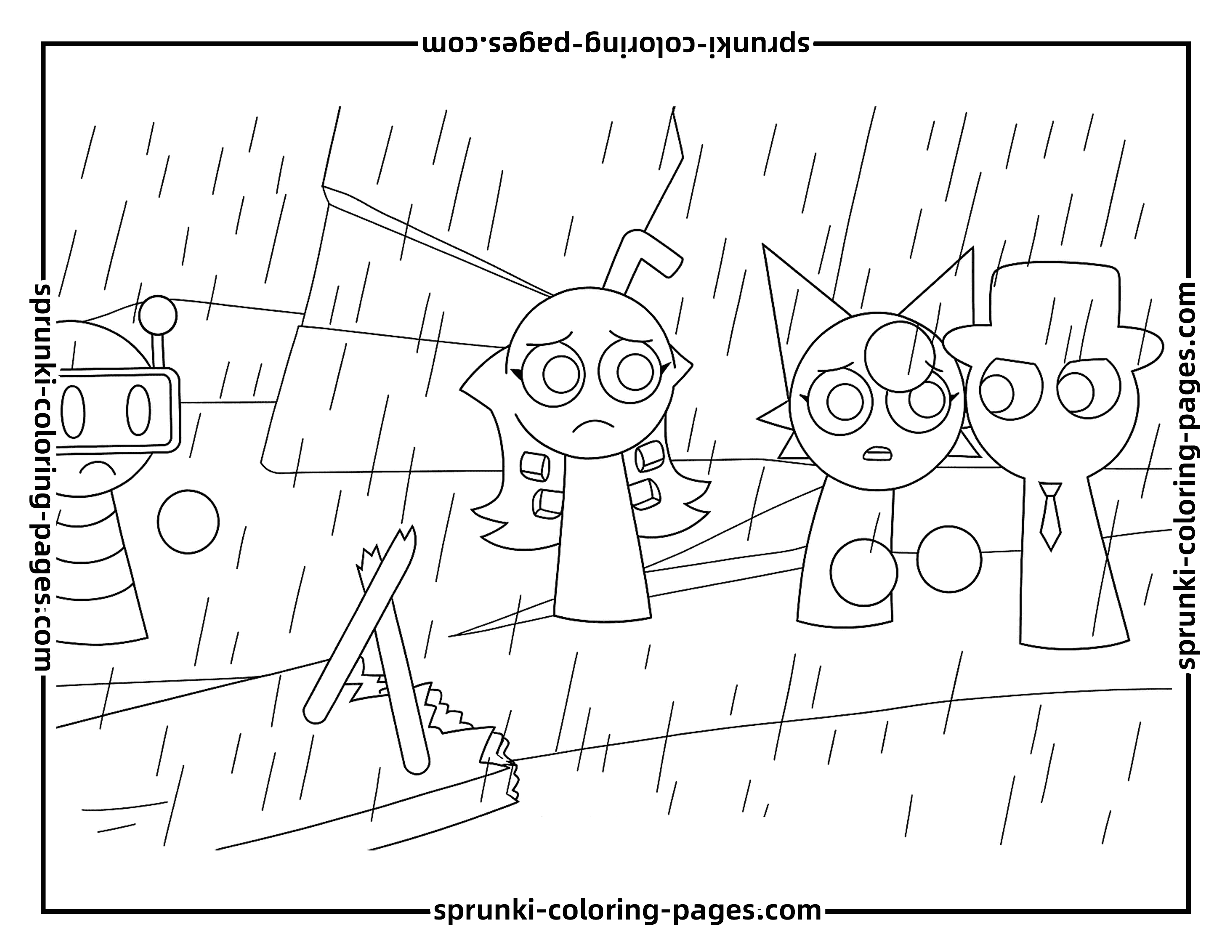 This Black Sprunki coloring page showcases Black and Oren along with their friends at the base of a mountain, thoughtfully discussing how to solve a challenging problem. The scene emphasizes teamwork and strategy, making it a fun and engaging addition to any Sprunki coloring pages collection. Kids and fans can add vibrant colors to bring this problem-solving moment to life, enhancing creativity and storytelling.