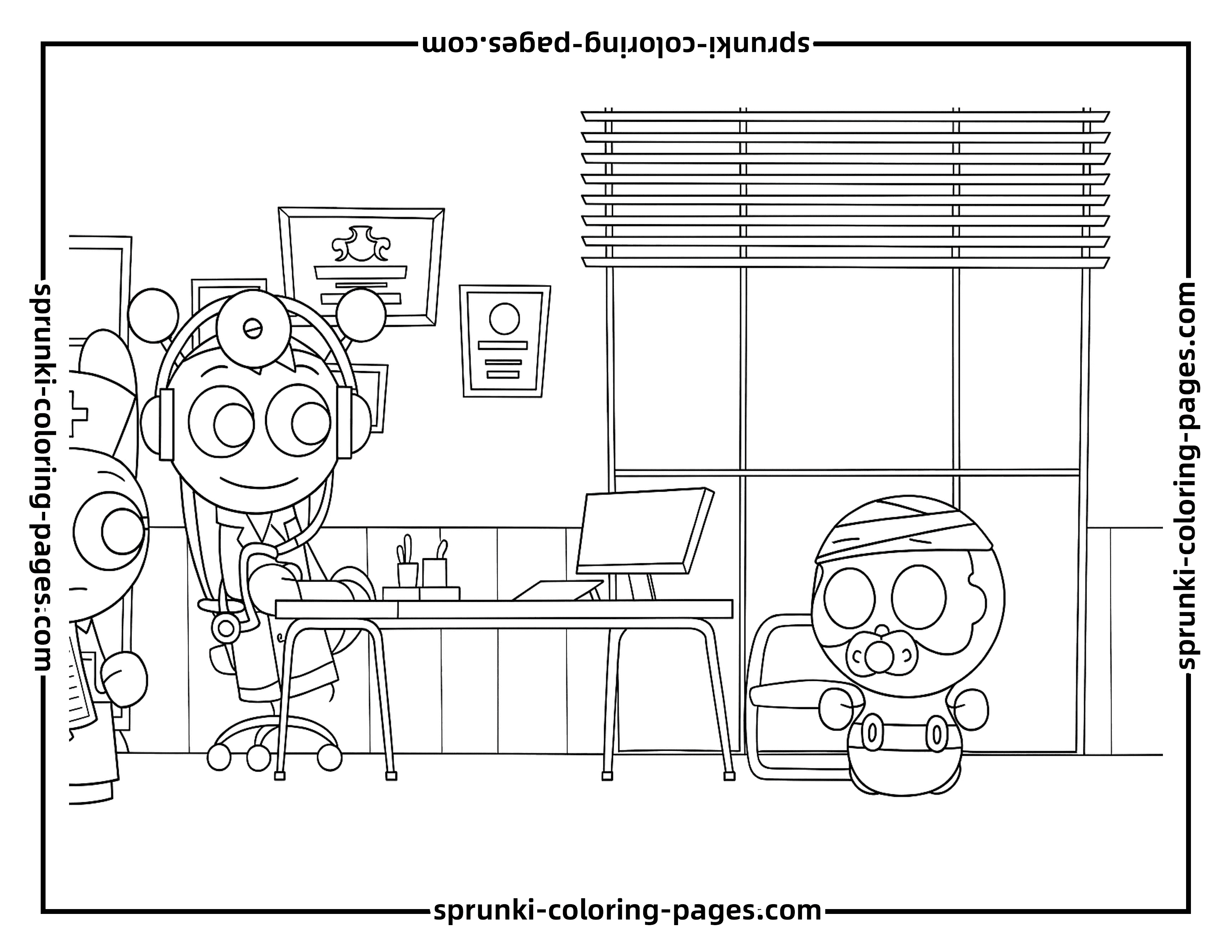 This black Sprunki coloring page depicts Oren in his doctor role, carefully examining black baby to ensure they are healthy and happy. The scene captures a nurturing moment full of character interaction, providing an engaging coloring activity. Fans can bring life to the details, from Oren’s attentive expression to the colorful hospital environment, making it a fun and educational experience for children and Sprunki enthusiasts alike.