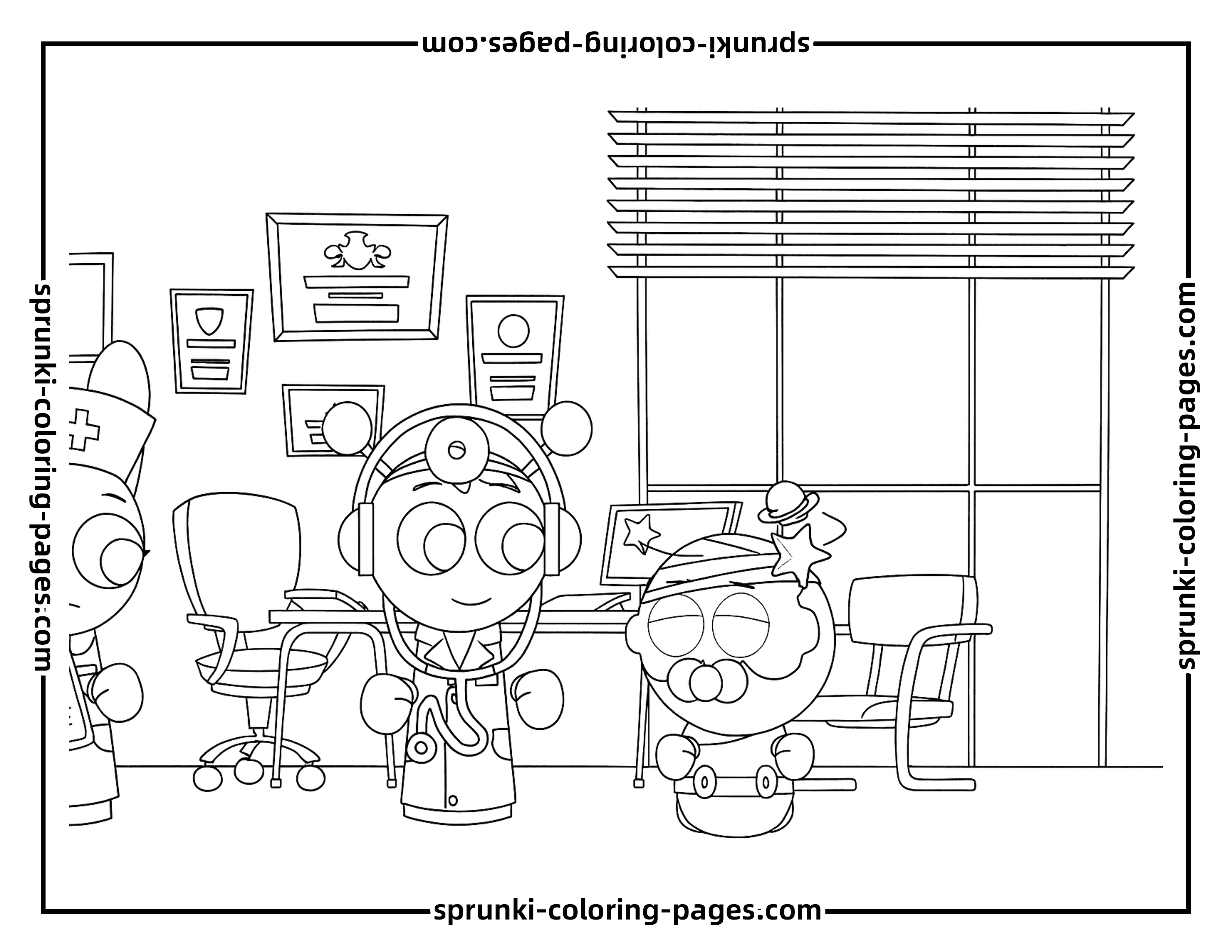 This black Sprunki coloring page depicts Oren in his doctor role, carefully examining black baby to ensure they are healthy and happy. The scene captures a nurturing moment full of character interaction, providing an engaging coloring activity. Fans can bring life to the details, from Oren’s attentive expression to the colorful hospital environment, making it a fun and educational experience for children and Sprunki enthusiasts alike.