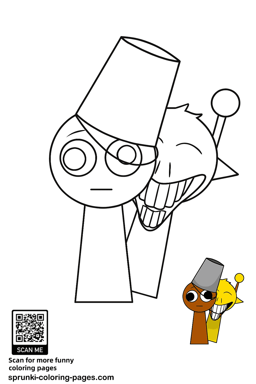 This Brud and Simon Sprunki coloring page shows Simon making a funny face behind Brud, perfect for kids and fans to print and color. Enjoy this playful printable Sprunki coloring page featuring your favorite characters.