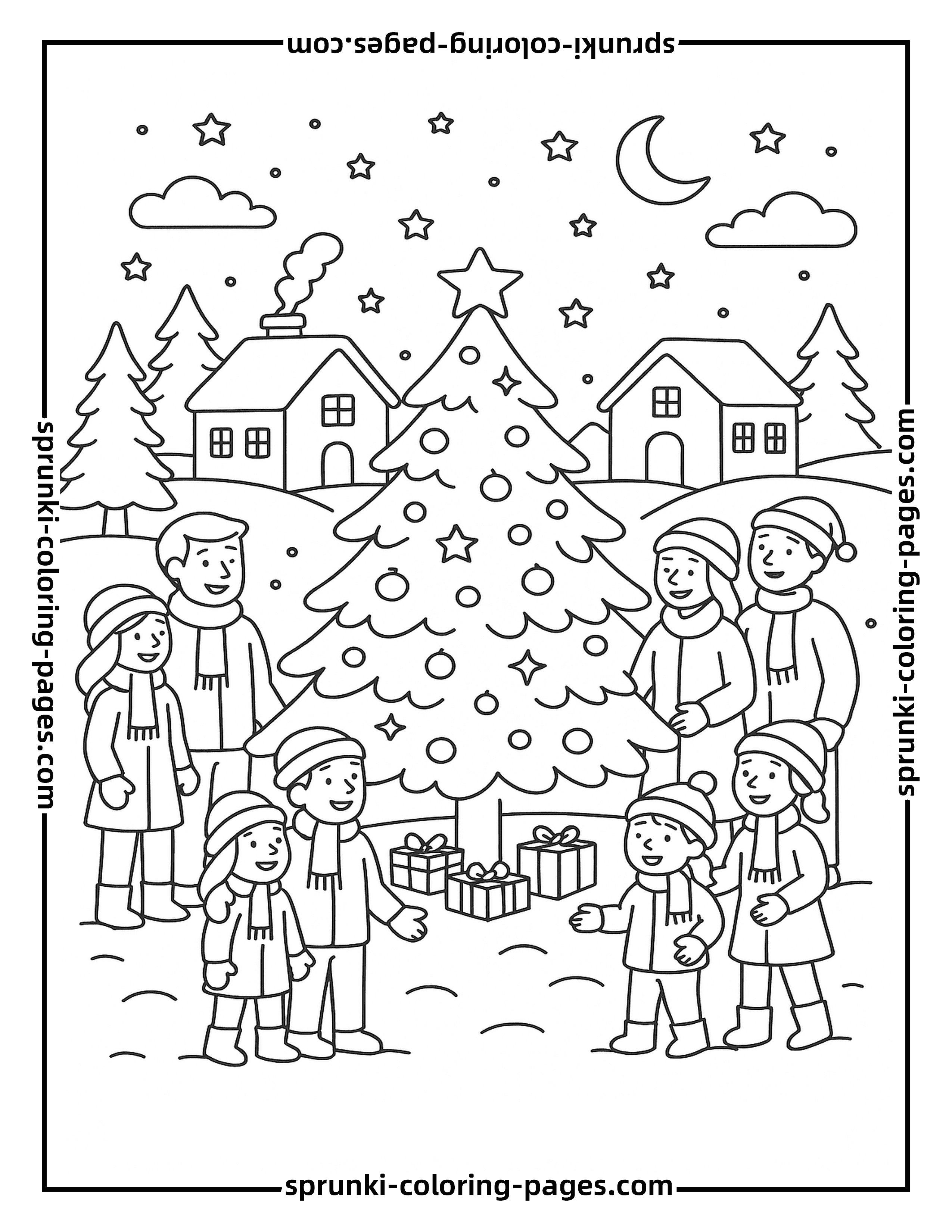 This Christmas Eve village Christmas tree coloring page features families gathered around a glowing tree in a snowy village, creating a warm and festive holiday scene. Perfect for kids and adults who enjoy detailed seasonal coloring, it brings the magic of Christmas to life. Explore more joyful designs in our christmas coloring pages collection and discover a wide variety of Christmas tree coloring pages for the festive season.