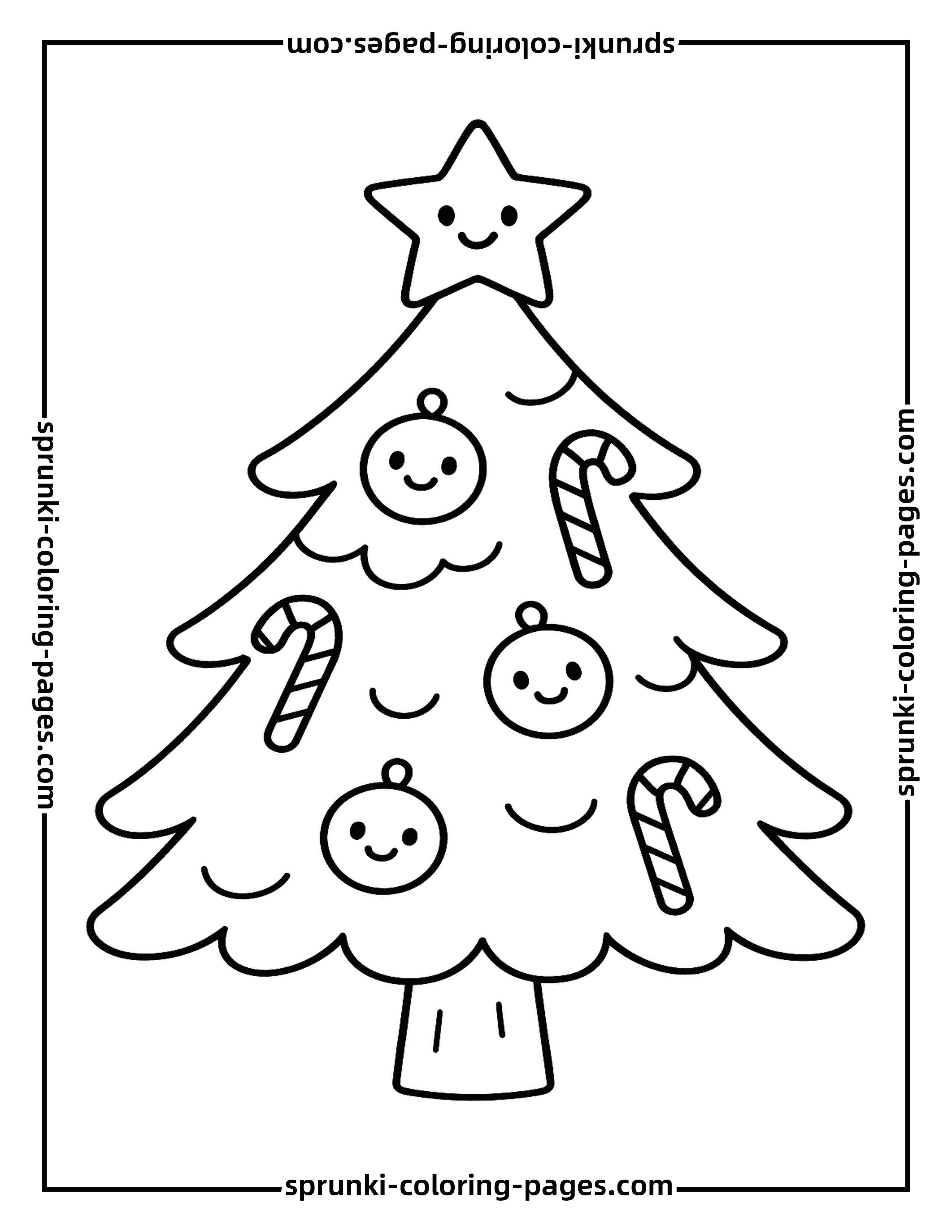 This cute cartoon-style Christmas tree coloring page features smiling ornaments, candy canes, and a shining star on top, designed especially for children. Perfect for easy and fun holiday coloring, this page allows kids to bring their favorite Christmas tree to life. Check out more christmas coloring pages for kids and enjoy a wide selection of festive and joyful Christmas tree coloring pages.