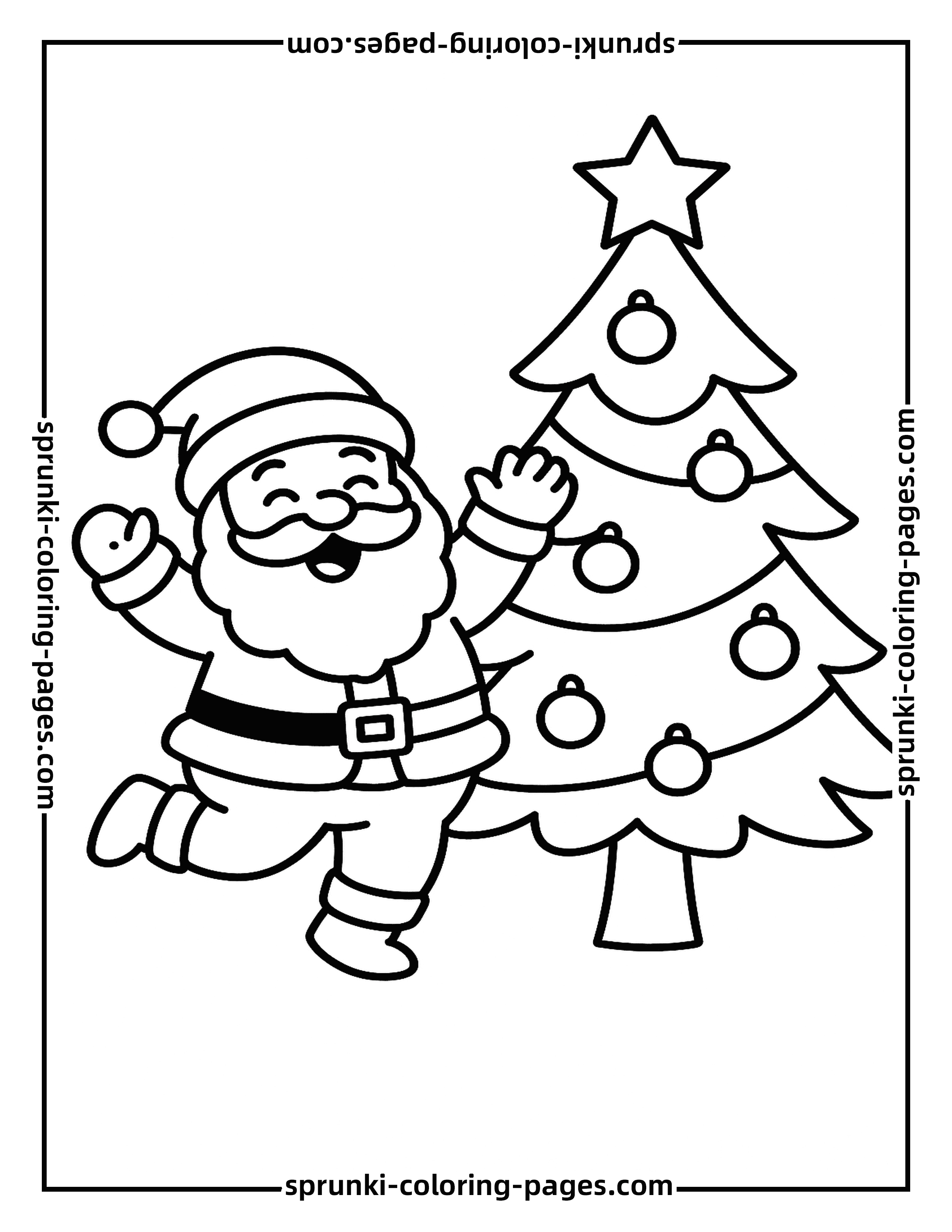 This joyful Santa dancing beside a Christmas tree is full of festive energy and holiday fun. With its large shapes and bold outlines, it’s perfect for young children to enjoy easy and creative coloring. Explore our full christmas coloring pages to find more cheerful Santa-themed designs that make Christmas brighter.