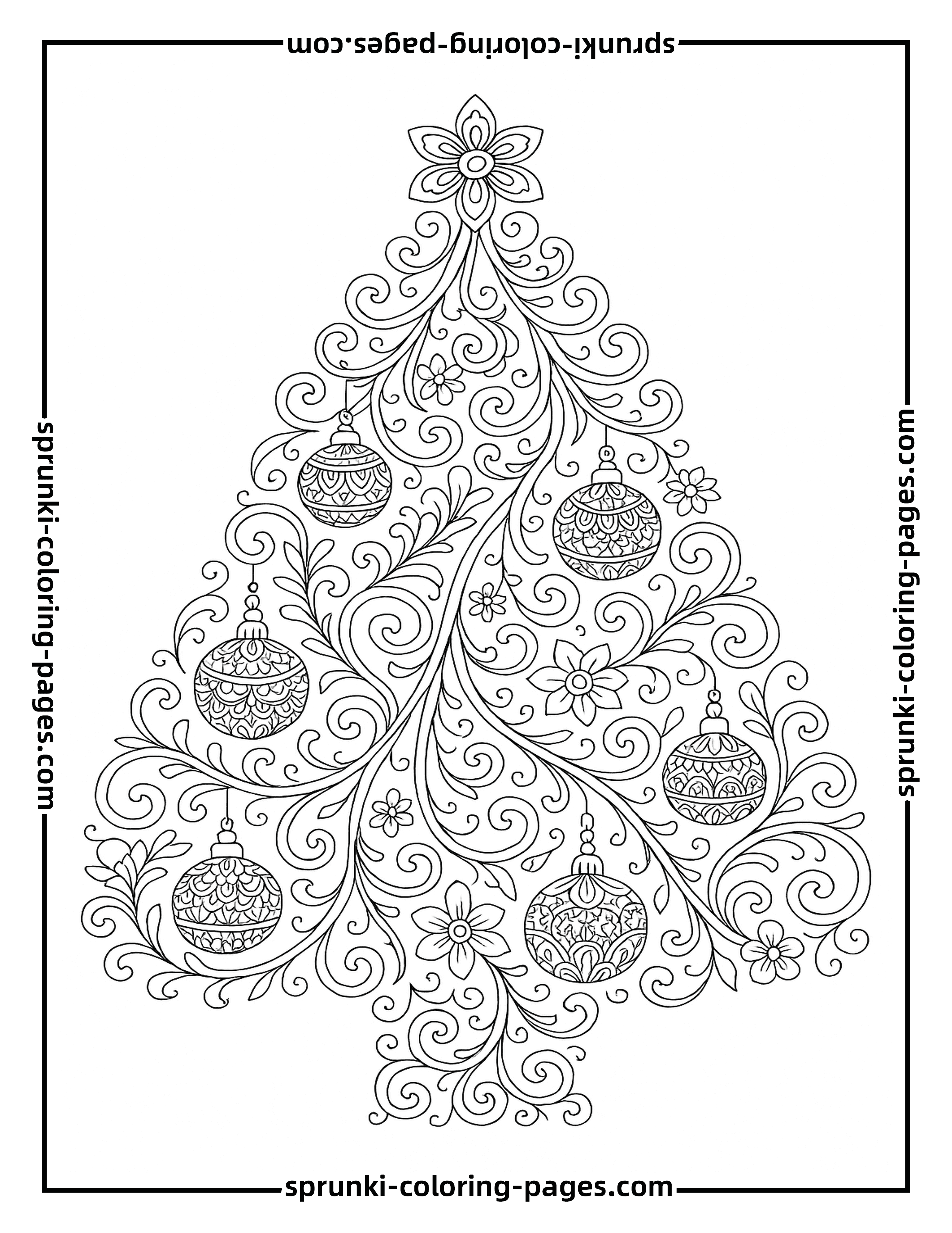 This whimsical Christmas tree coloring page for adults uses layered curls, ribbon waves and clustered ornaments to create a playful yet detailed holiday illustration. With its flowing filigree borders and clean printable outline, it adds creative variety to your seasonal [christmas coloring pages](/) and offers an enjoyable mix of intricate and open coloring spaces.