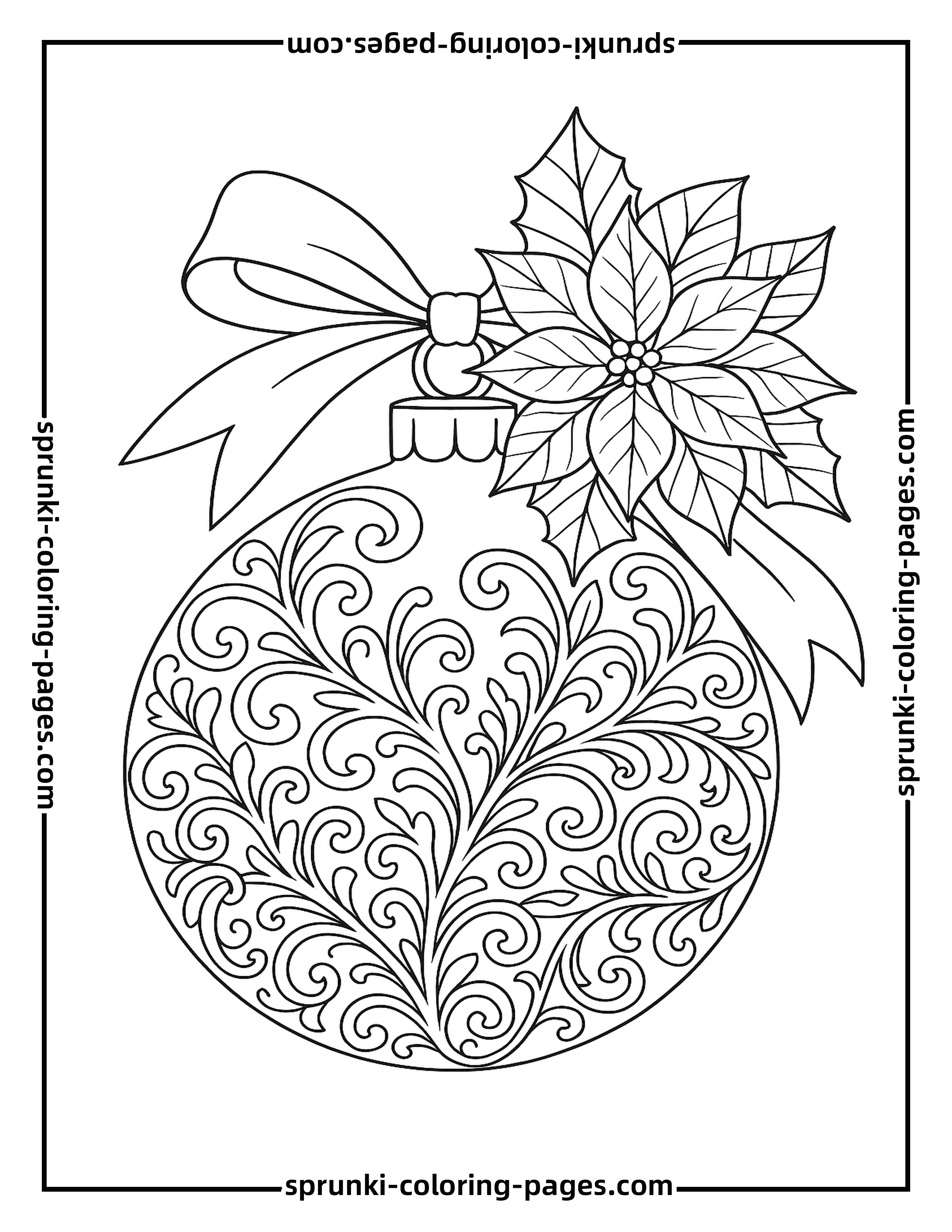This Christmas Ornament Coloring Page for Adults showcases an ornament decorated with elegant filigree, poinsettia, and ribbon patterns, ideal for intricate christmas coloring pages.