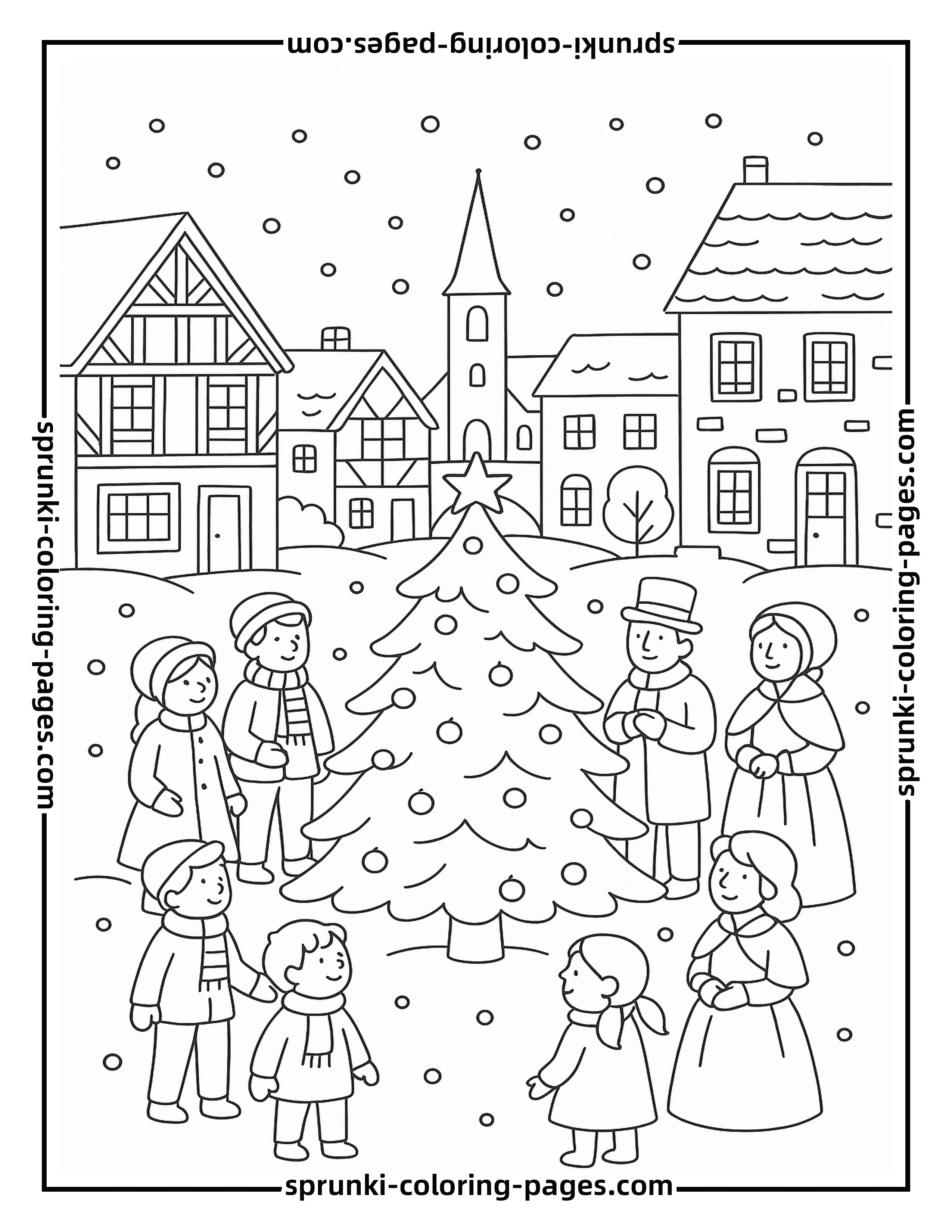 This European village Christmas tree coloring page depicts a grand tree under soft snowfall with townsfolk gathered around, capturing a vintage holiday atmosphere. Perfect for kids and adults to enjoy festive coloring. Explore more christmas coloring pages and a variety of Christmas tree coloring pages for seasonal creativity.