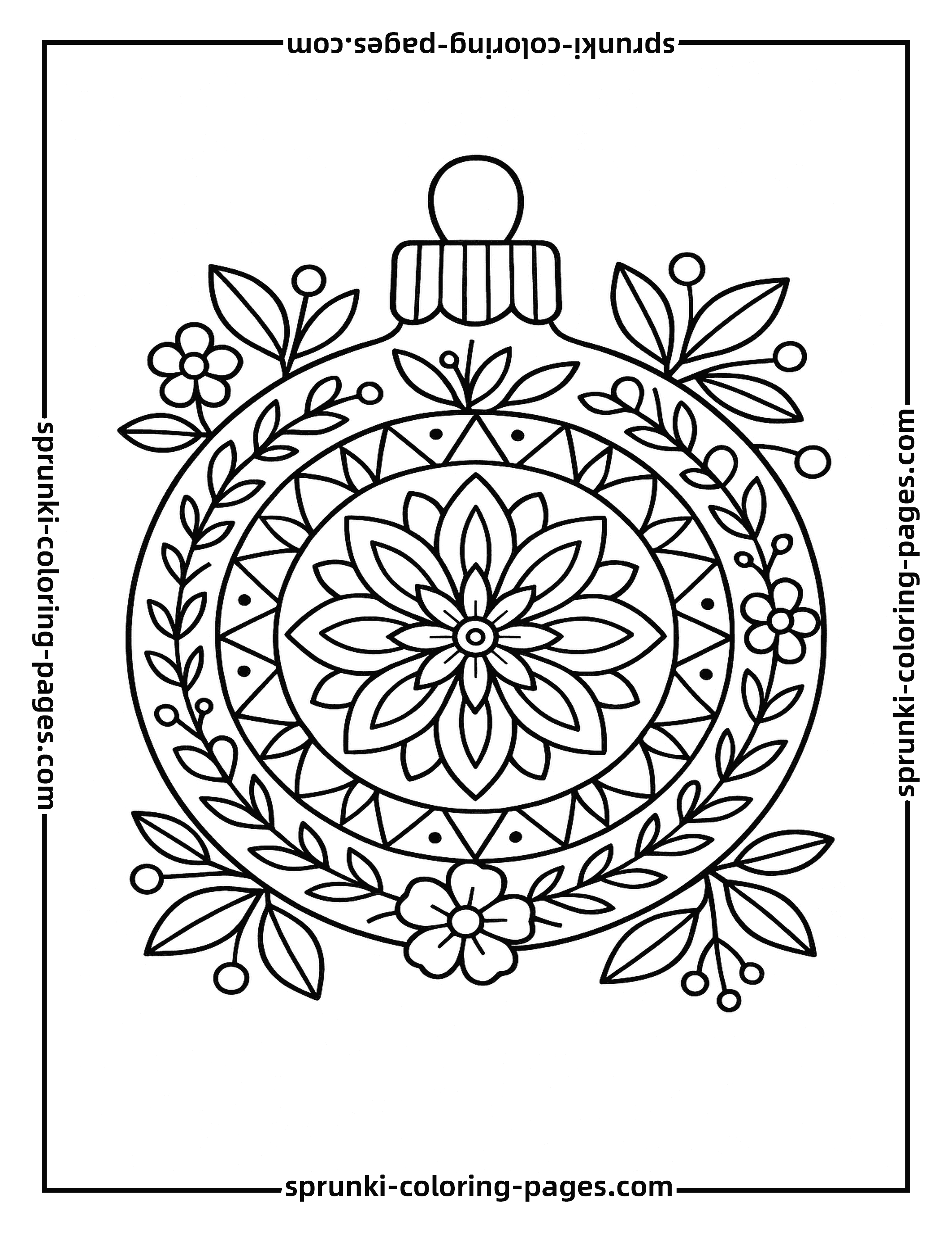 This Christmas Ornament Coloring Page for Adults features a holiday bauble with geometric mandala and floral patterns, perfect for sophisticated and artistic christmas coloring pages enjoyment.