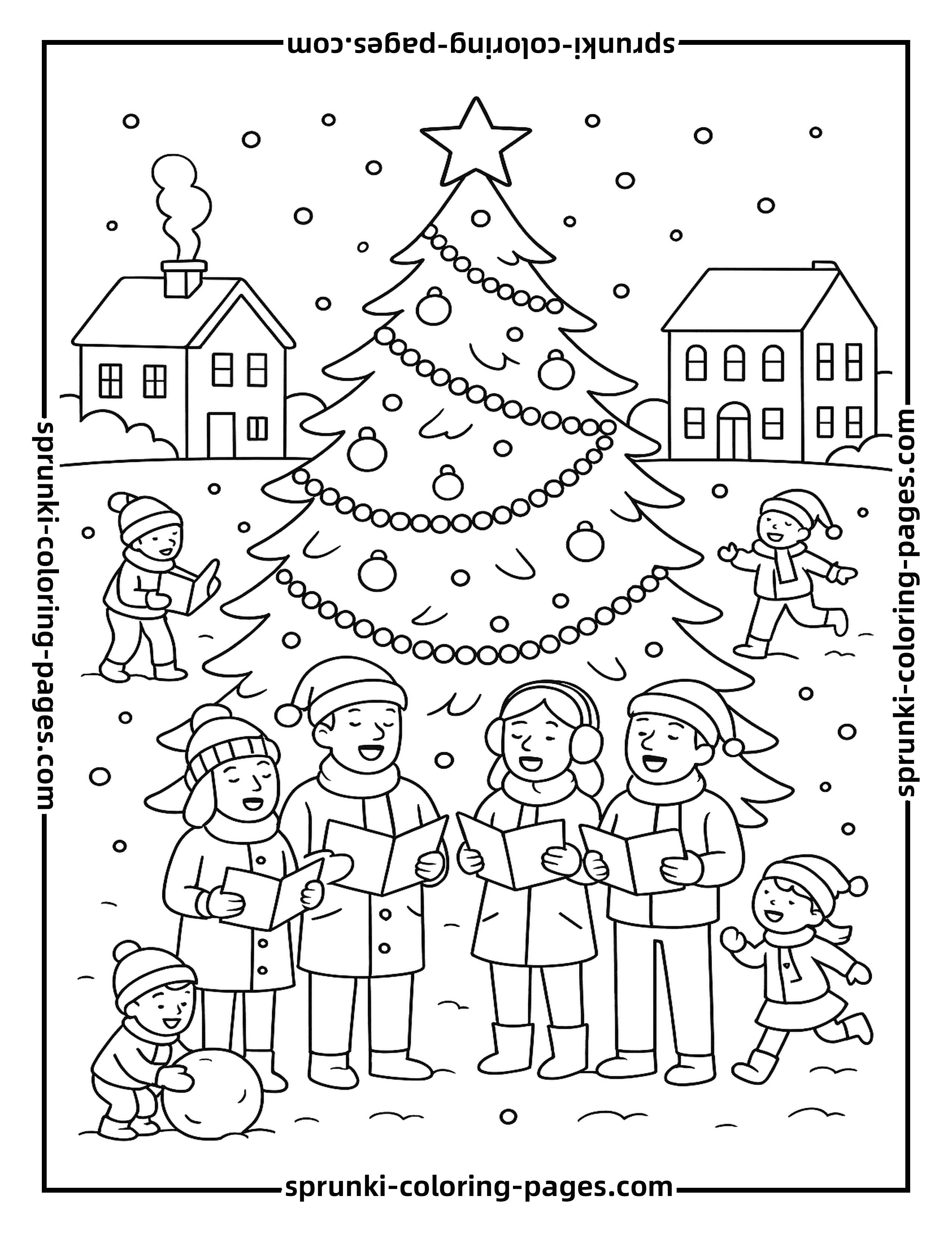 This giant town square Christmas tree coloring page captures a festive scene with people singing carols and children playing in the snow. Perfect for holiday creativity, this coloring page is fun for kids and adults alike. Discover more festive designs in our christmas coloring pages collection and enjoy a variety of Christmas tree coloring pages to celebrate the season.