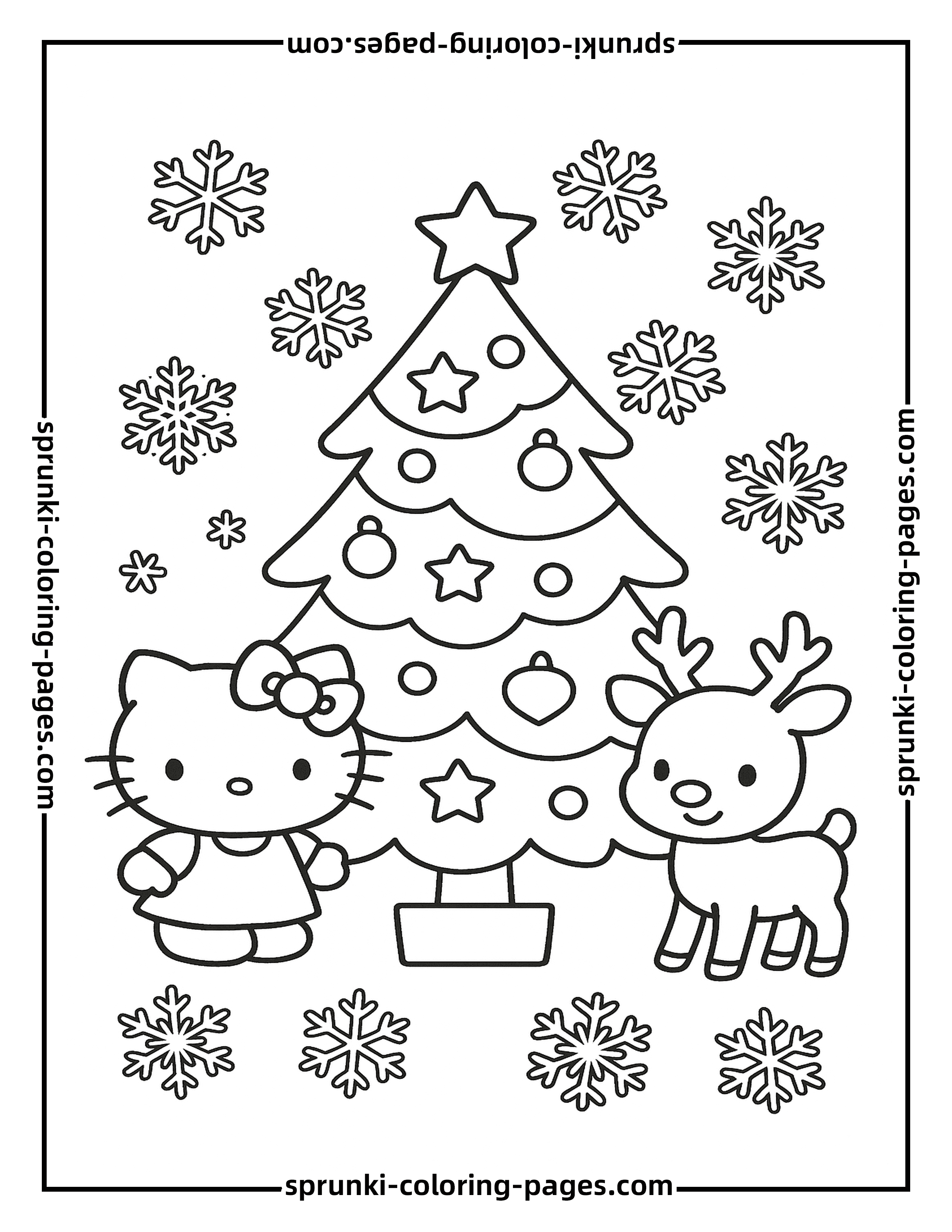 This Hello Kitty Christmas tree coloring page features the beloved character alongside reindeer and snowflakes, creating a cute and festive holiday scene. Perfect for children to enjoy coloring, it brings joy and creativity to the season. Explore more delightful designs in our christmas coloring pages collection and a variety of Christmas tree coloring pages for kids.
