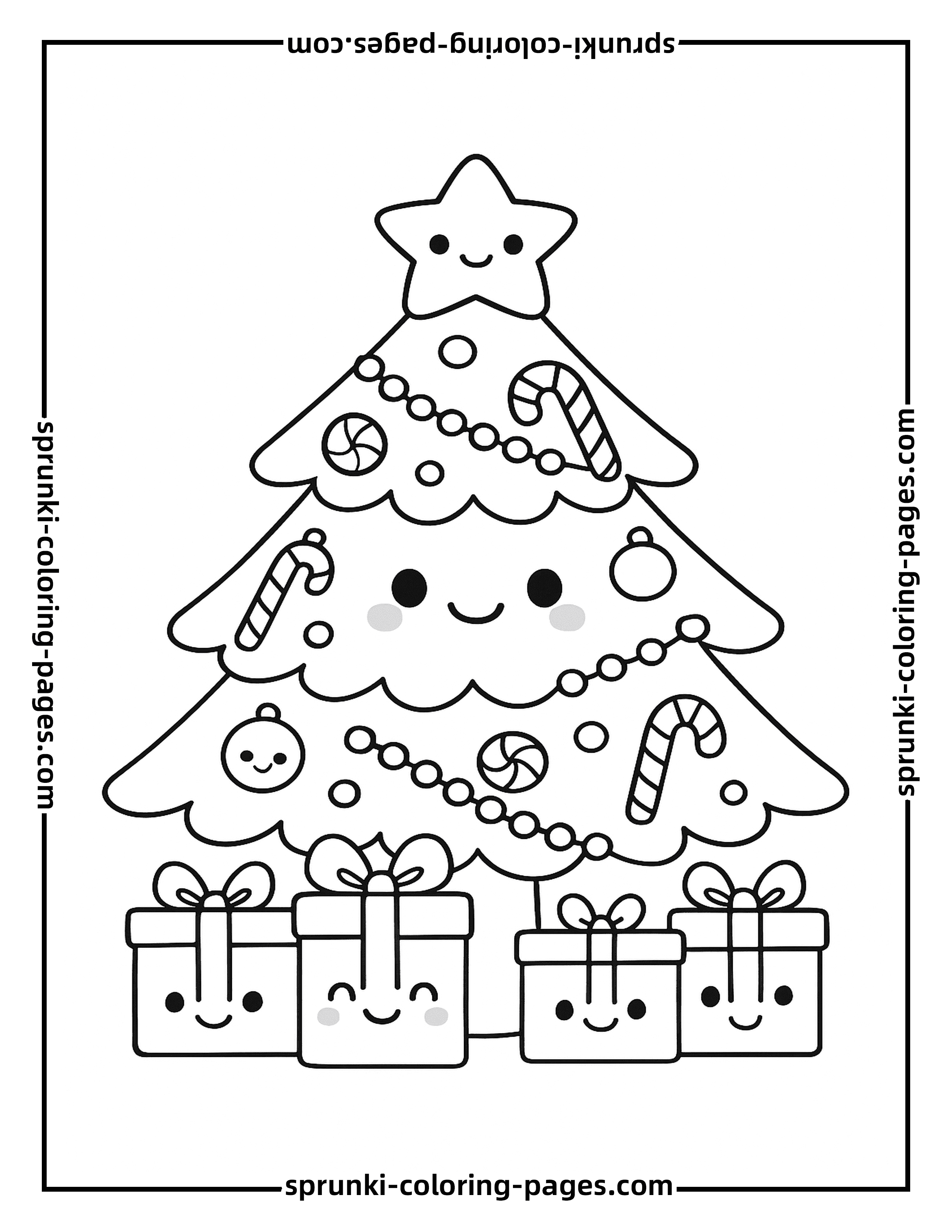 This kawaii-style Christmas tree coloring page is full of smiling faces, presents, and candy decorations, designed to delight children. Fun and easy to color, it’s perfect for holiday activities. Discover more festive fun in our christmas coloring pages collection and explore an array of Christmas tree coloring pages for kids.