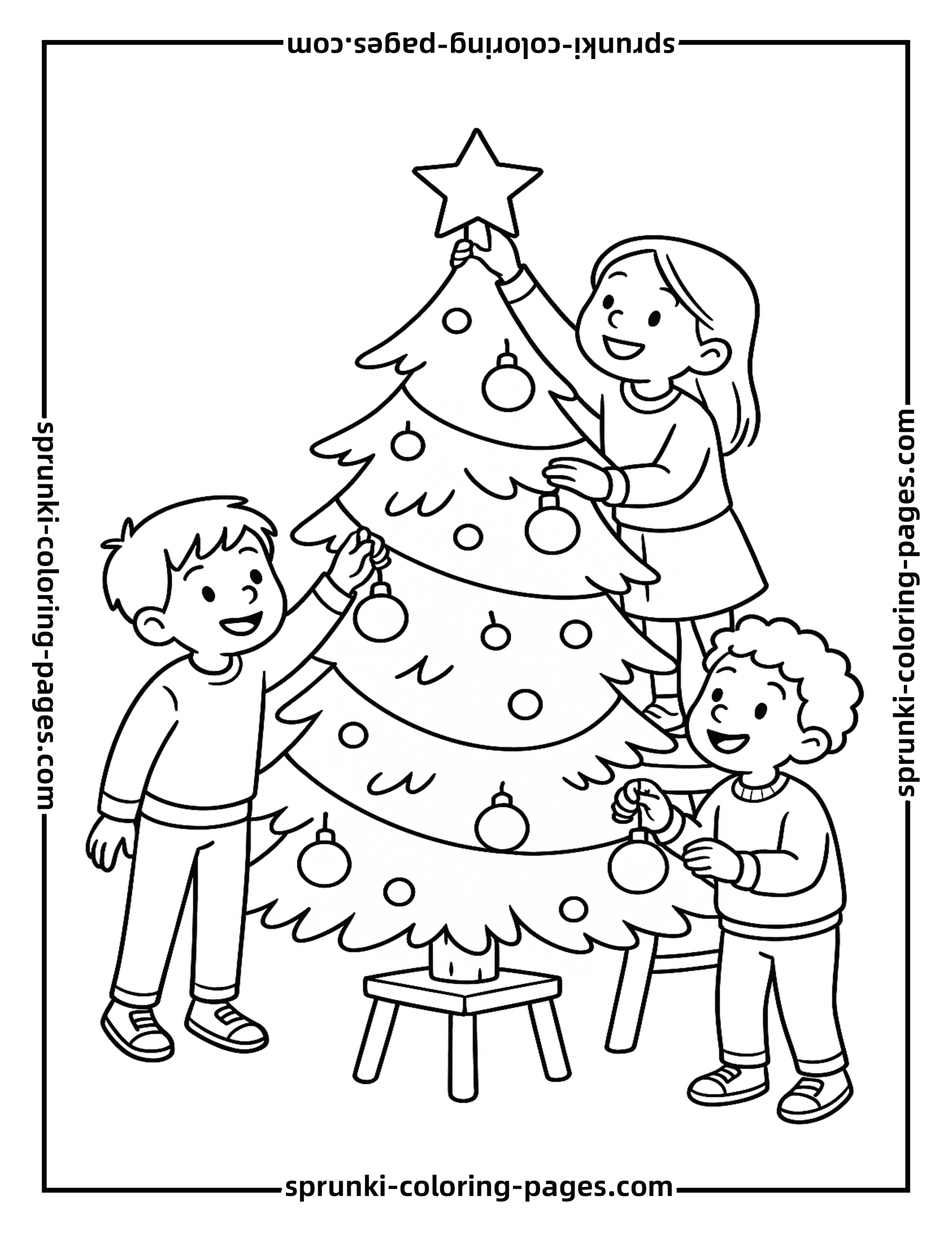 Kids Decorating Tree – Easy Christmas Coloring Page