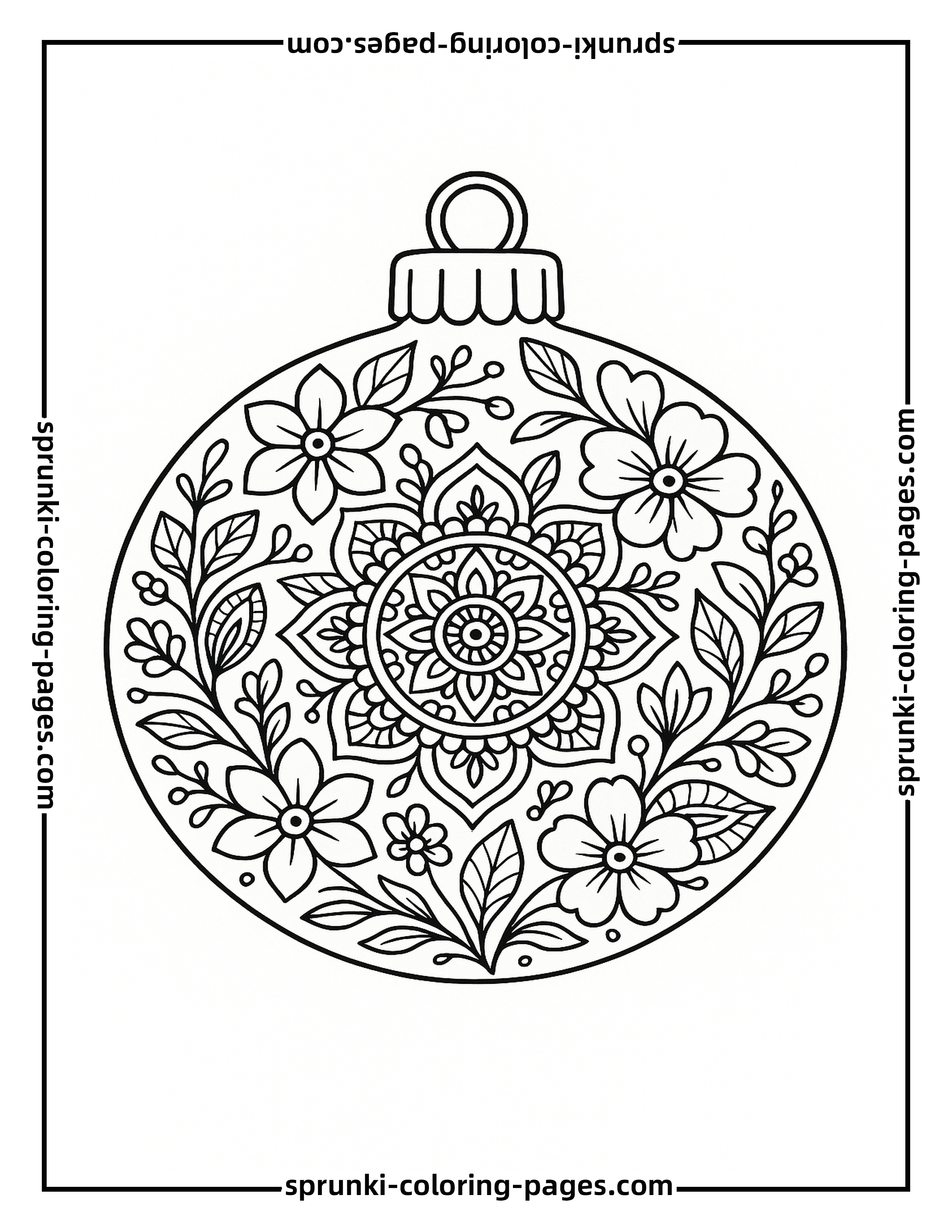 This Christmas Ornament Coloring Page for Adults features intricate layered mandala and floral patterns, perfect for stress relief and festive christmas coloring pages enjoyment.