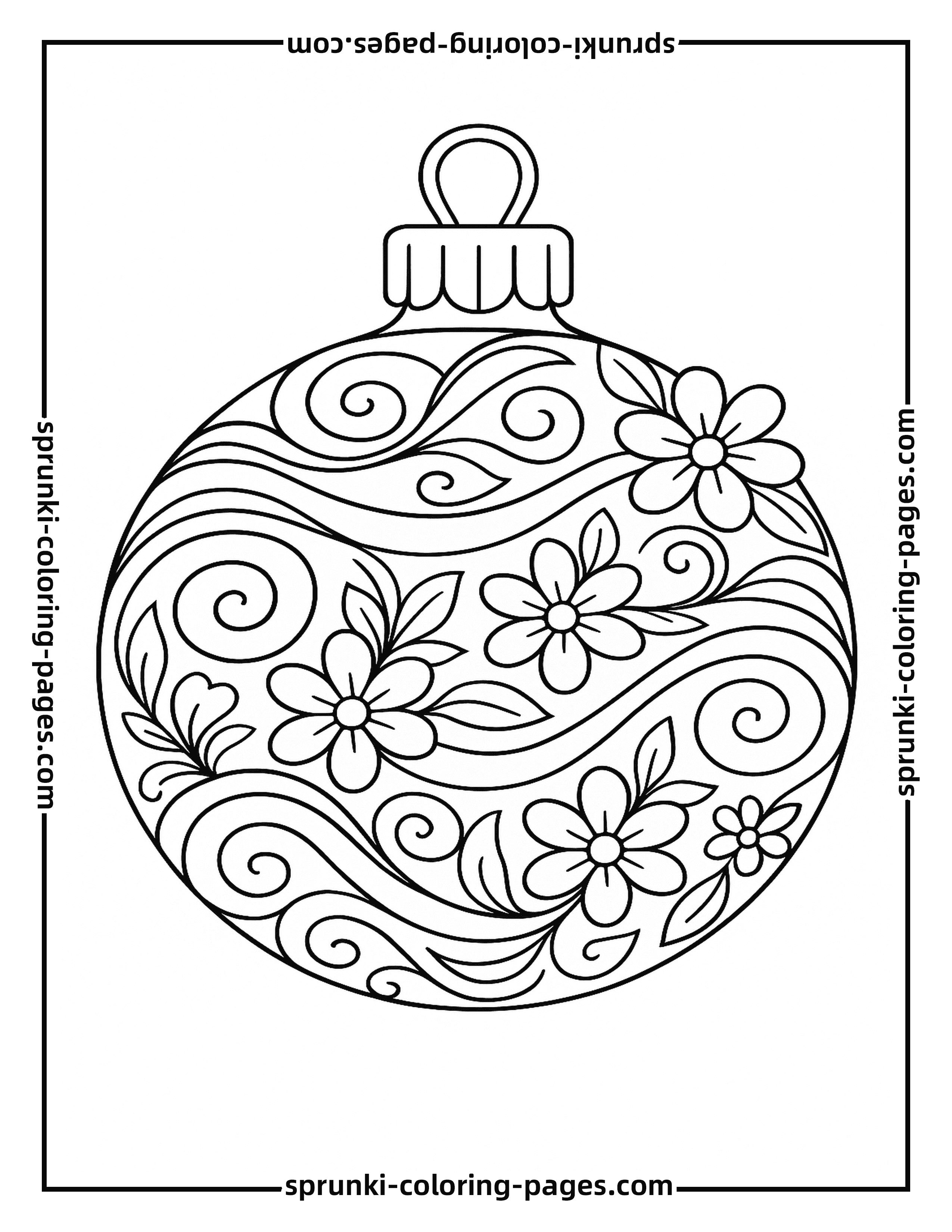 This Christmas Ornament Coloring Page for Adults features an elegant bauble with layered swirl and floral motifs, perfect for detailed christmas coloring pages.