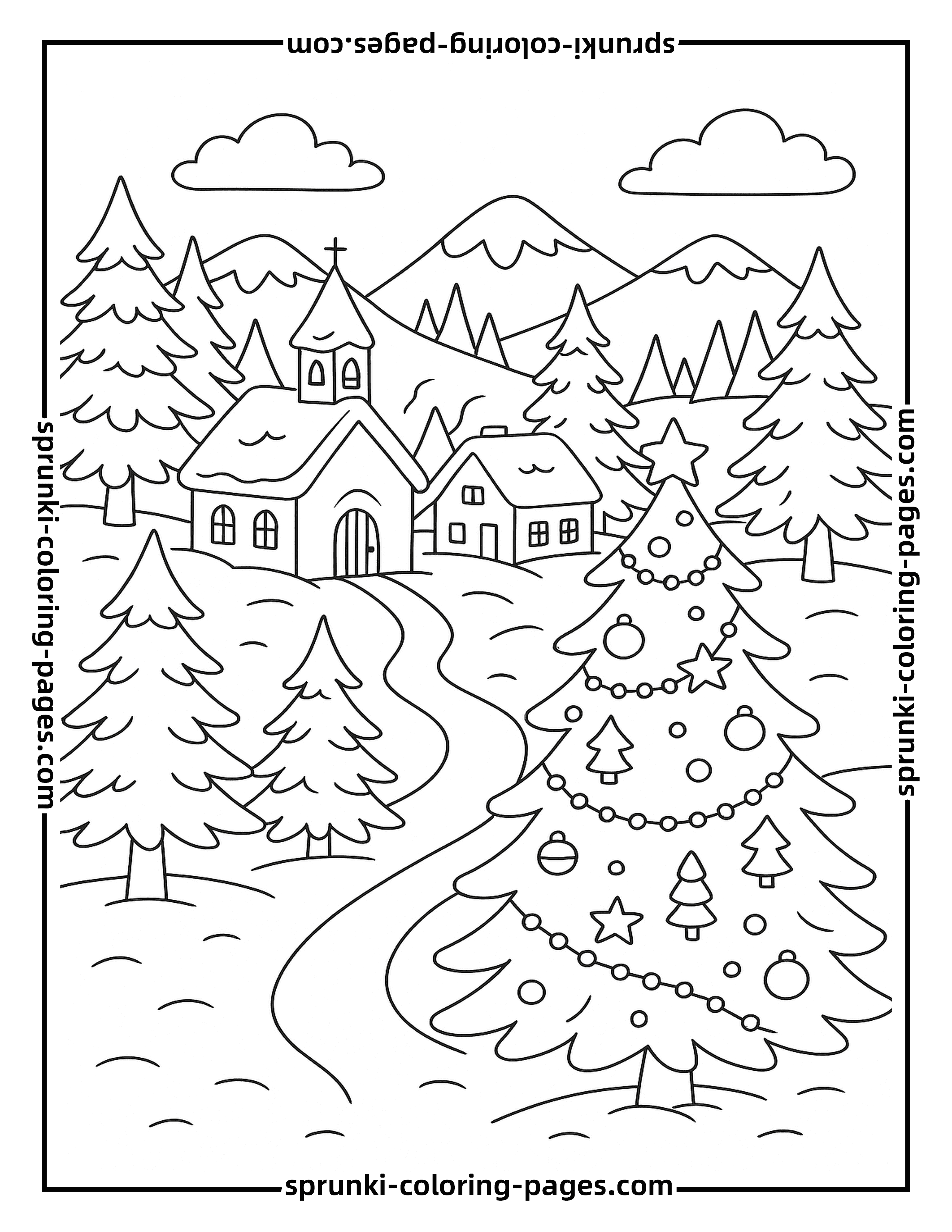 This mountain chapel Christmas tree coloring page depicts a small snowy village with pine trees and a decorated tree at the chapel, perfect for kids and adults who enjoy festive winter coloring. Discover more holiday designs in our christmas coloring pages collection and explore a wide variety of Christmas tree coloring pages.