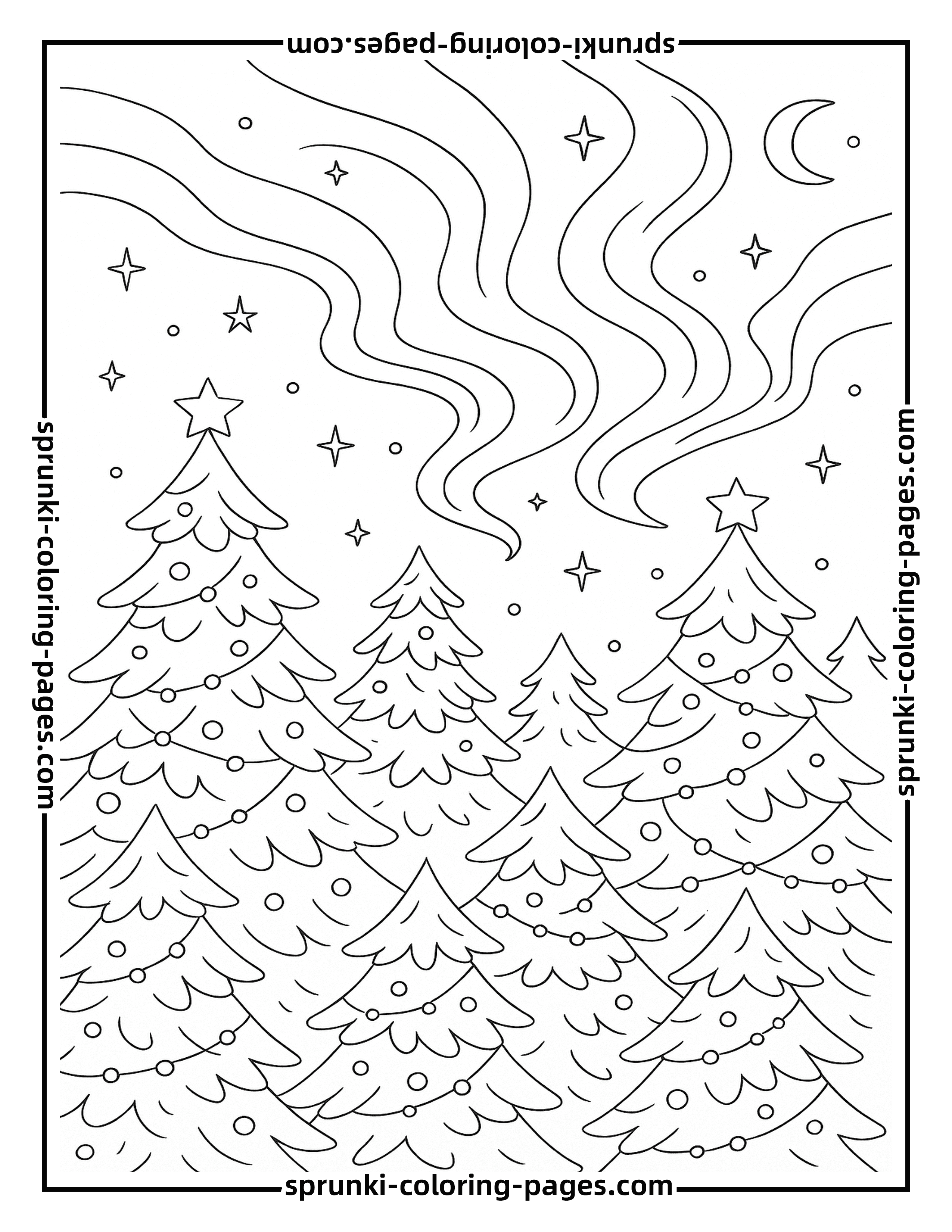 This magical Christmas tree coloring page depicts a forest under the Northern Lights, filled with sparkling trees perfect for holiday coloring. Both kids and adults can enjoy the intricate black-and-white design and bring festive magic to life. Discover more creative christmas coloring pages and explore a variety of Christmas tree coloring pages for the season.