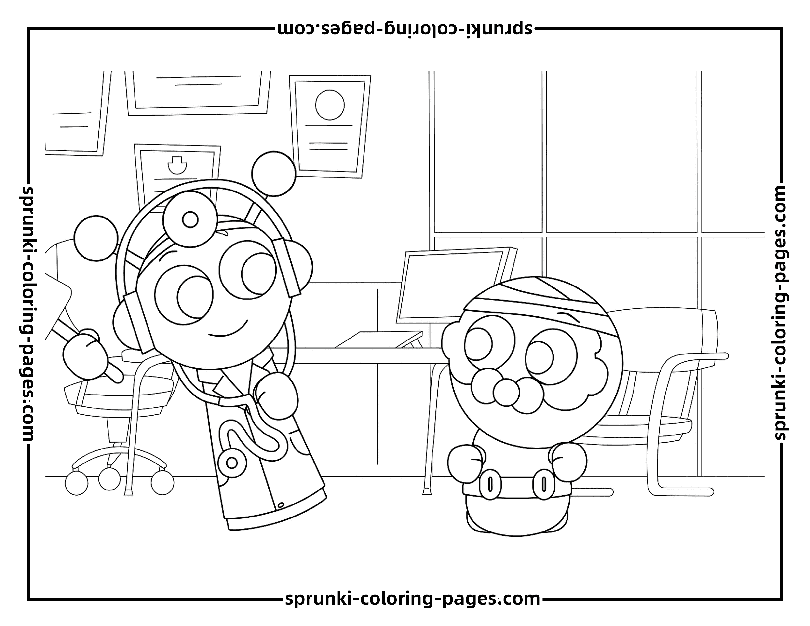 This black Sprunki coloring page depicts Oren in his doctor role, carefully examining black baby to ensure they are healthy and happy. The scene captures a nurturing moment full of character interaction, providing an engaging coloring activity. Fans can bring life to the details, from Oren’s attentive expression to the colorful hospital environment, making it a fun and educational experience for children and Sprunki enthusiasts alike.