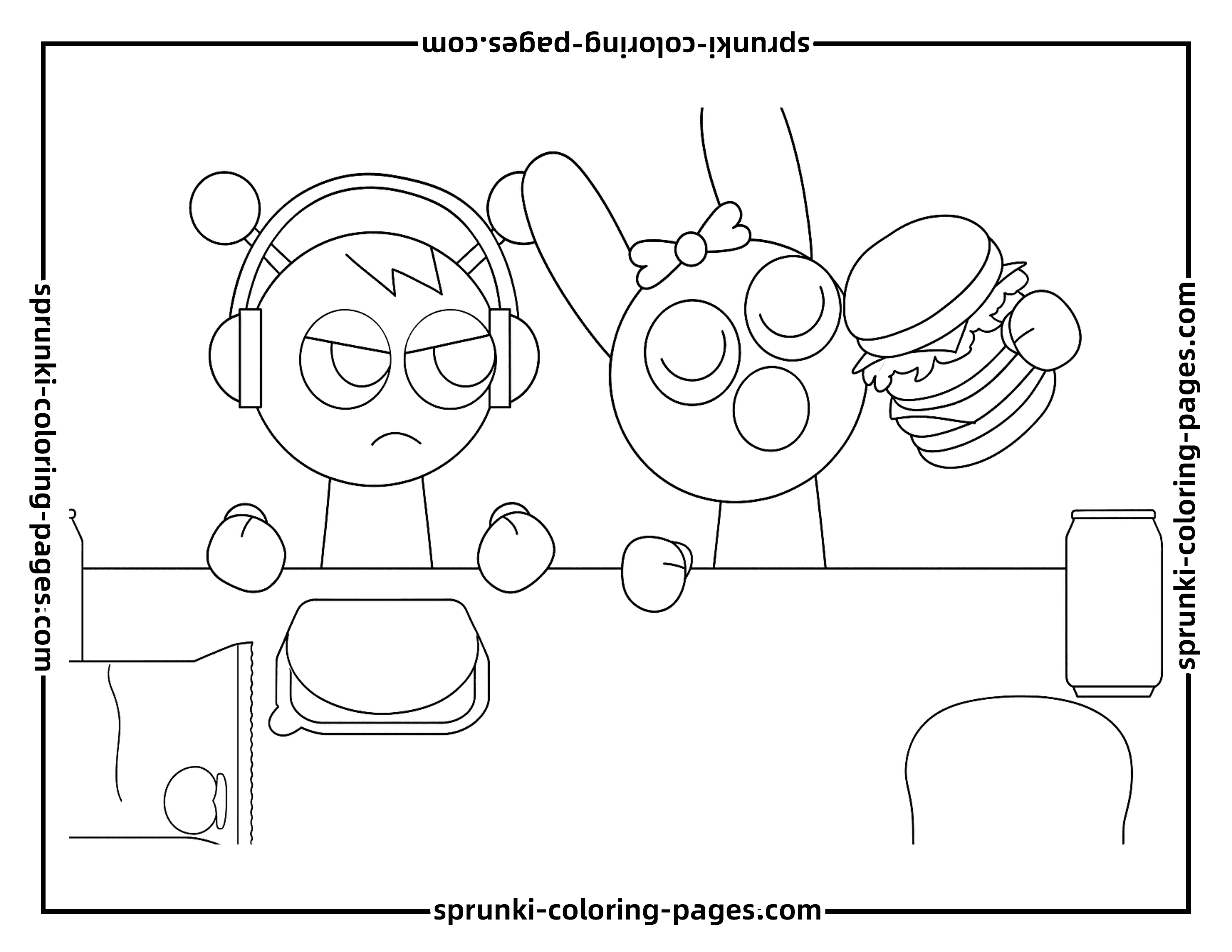 This Pinki Sprunki coloring page captures a delightful moment where Pinki and Oren are getting ready to enjoy their drinks together. The illustration emphasizes their happy expressions and the colorful drinks, making it an engaging and fun activity for Sprunki fans. Kids and coloring enthusiasts can bring this scene to life with vibrant colors, highlighting the cheerful and playful atmosphere shared by Pinki and Oren.