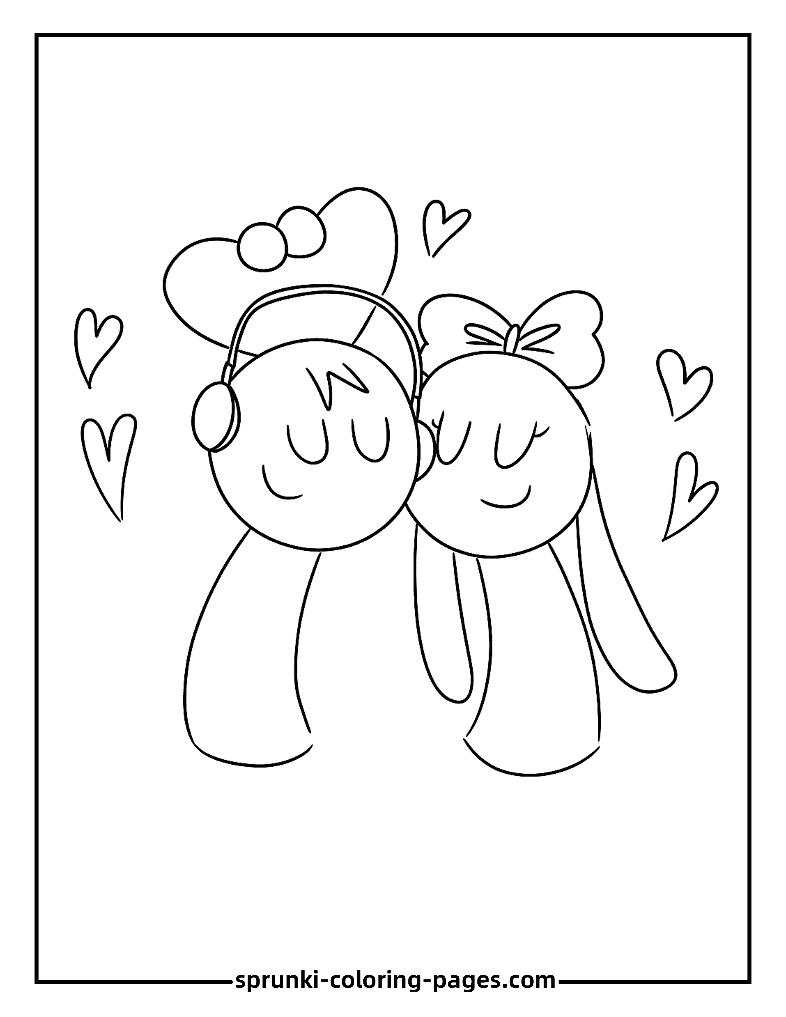 This Pinki Sprunki Coloring Page depicts a touching and romantic moment where Oren expresses his love to Pinki, highlighting the deep connection between these two characters from Incredibox - Sprunki. In this scene, you can see Oren’s affection for Pinki, bringing their relationship to life through your colors. Pinki’s iconic pink fur and her magenta bow contrast beautifully with Oren’s expressions of love, making this a sweet and heartwarming page to color. Whether you choose soft, pastel hues or vibrant shades, this coloring page allows you to bring out the love and warmth in their bond. Fans of the Sprunki series will enjoy filling in the colors of this romantic moment that showcases the gentle and caring nature of both characters.