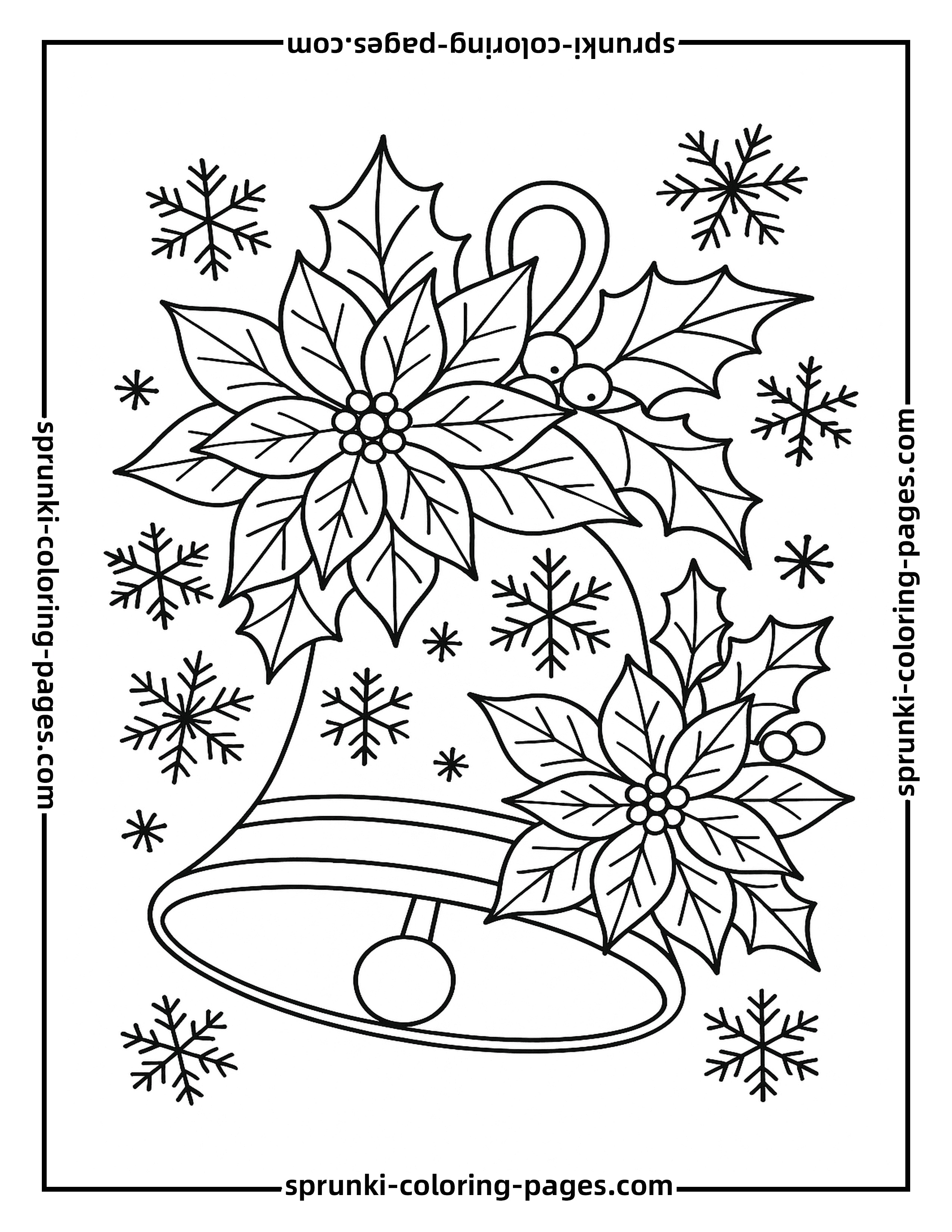 This Christmas Ornament Coloring Page for Adults features a detailed bell decorated with poinsettias, holly, and snowflakes, perfect for holiday christmas coloring pages relaxation.