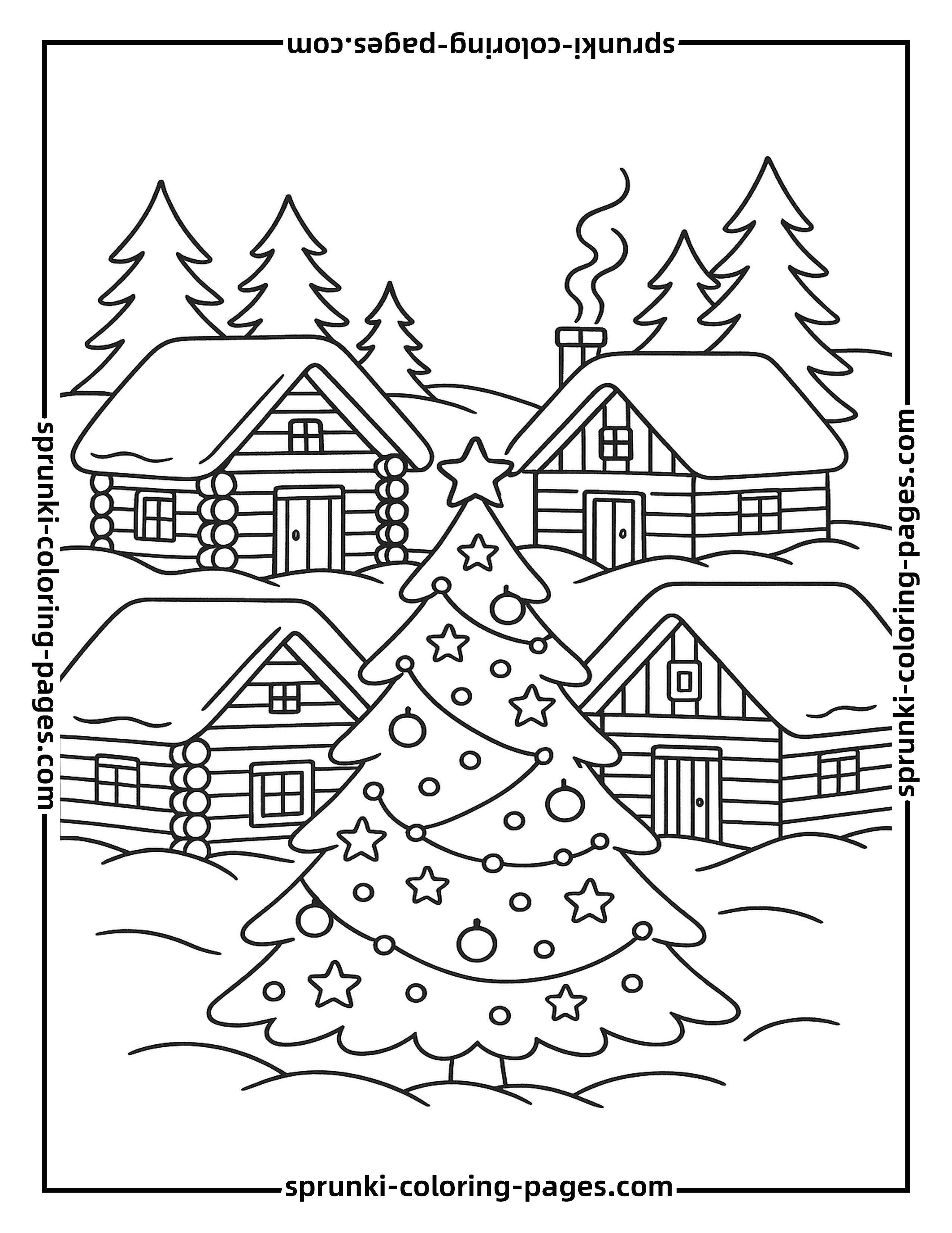 This rustic village Christmas tree coloring page features snow-covered wooden cabins and a beautifully decorated tree, perfect for kids and adults to enjoy holiday coloring. It captures the charm of a peaceful winter village. Discover more festive designs in our christmas coloring pages collection and explore a wide range of Christmas tree coloring pages.