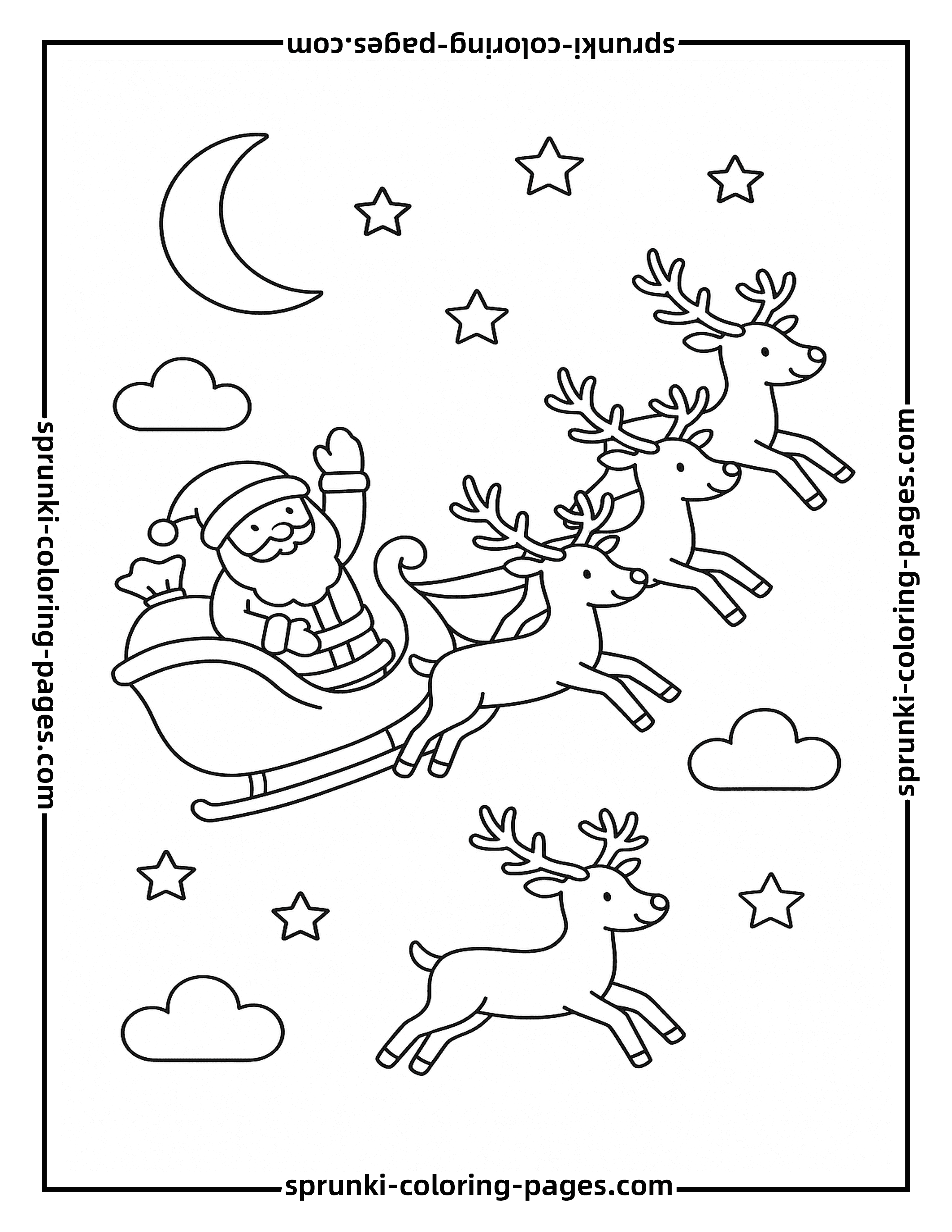 Santa Flying with Reindeer – Easy Christmas Coloring Pages