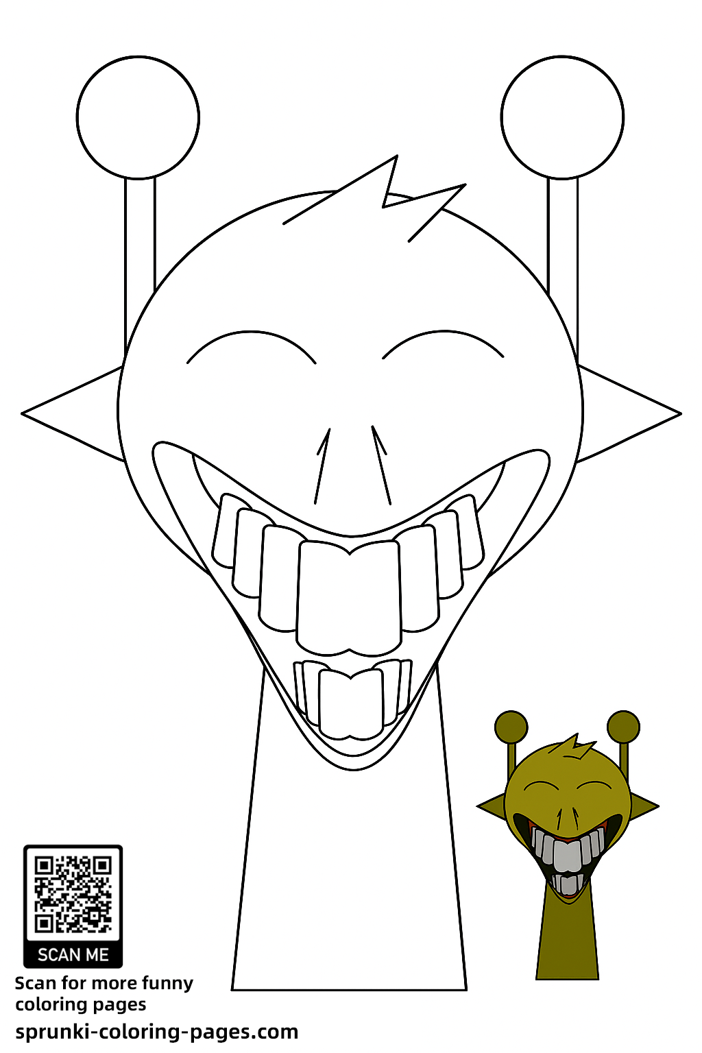 Get this eerie Simon Sprunki Coloring Page – Sinister Grin Expression—a free, printable sheet capturing Simon’s creepy smile from the Incredibox Sprunki mod! This coloring page features Simon in his yellow alien form, with a sharp, sinister grin, signature spiky horns, and straight antennae. Perfect for adding moody colors: use deep yellows for his body, dark grays for subtle shading, and faint reds (to amp up the creep factor) to highlight his (strange smile). No sign-ups required: print directly from your browser, save as a PDF for later, or color digitally. It’s great for Sprunki fans who love subtle horror vibes, or anyone wanting a unique coloring challenge—pair it with horror-themed Sprunki pages to build a spooky scene!