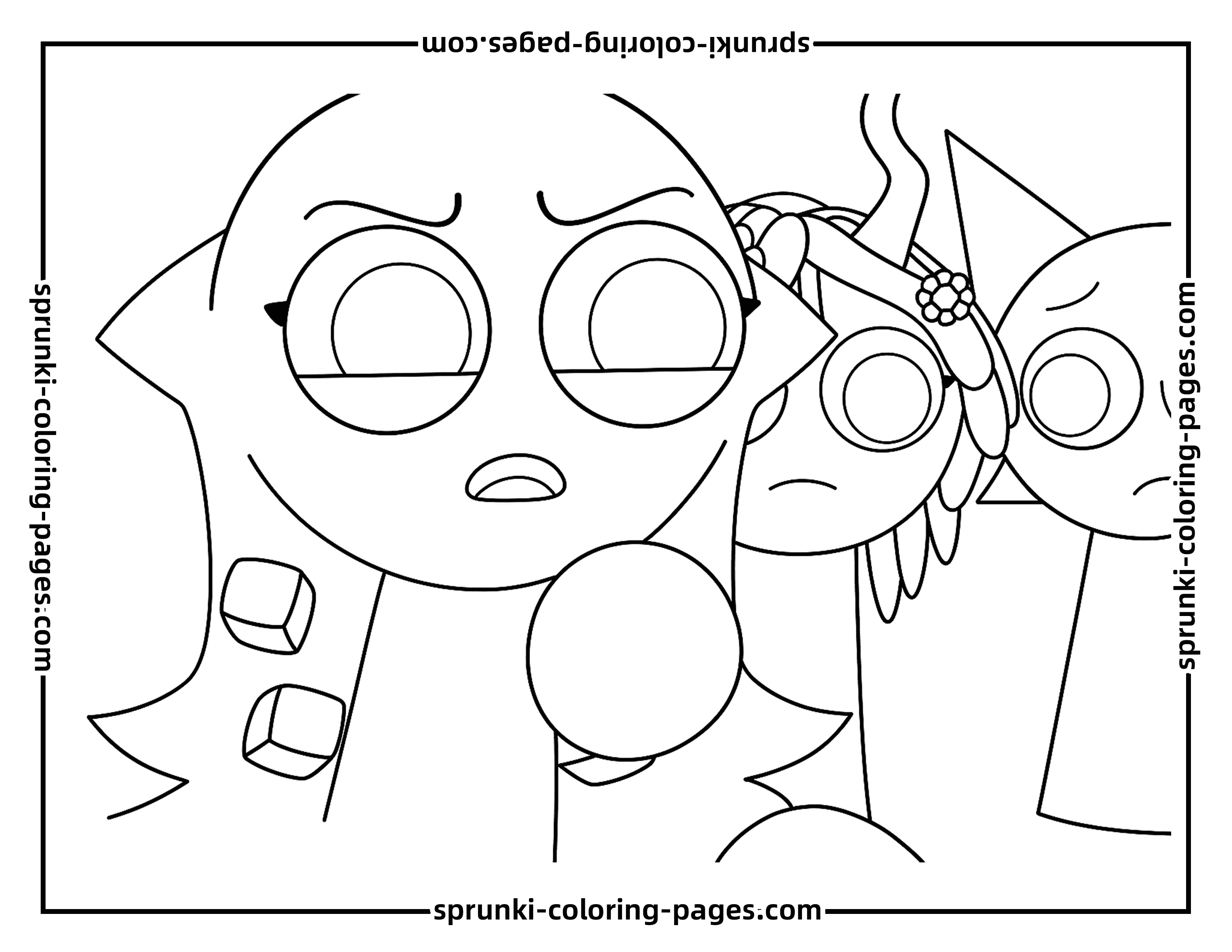 This Sky Sprunki coloring page features Sky with a wide-open shocked expression, surrounded by his equally surprised friends, capturing a moment of excitement and suspense. The detailed illustration provides a dynamic scene with expressive faces and playful energy, allowing fans to use a variety of colors to bring the characters to life. Ideal for Sprunki coloring page enthusiasts, this page adds fun and creativity to any collection of Sprunki-themed activities.