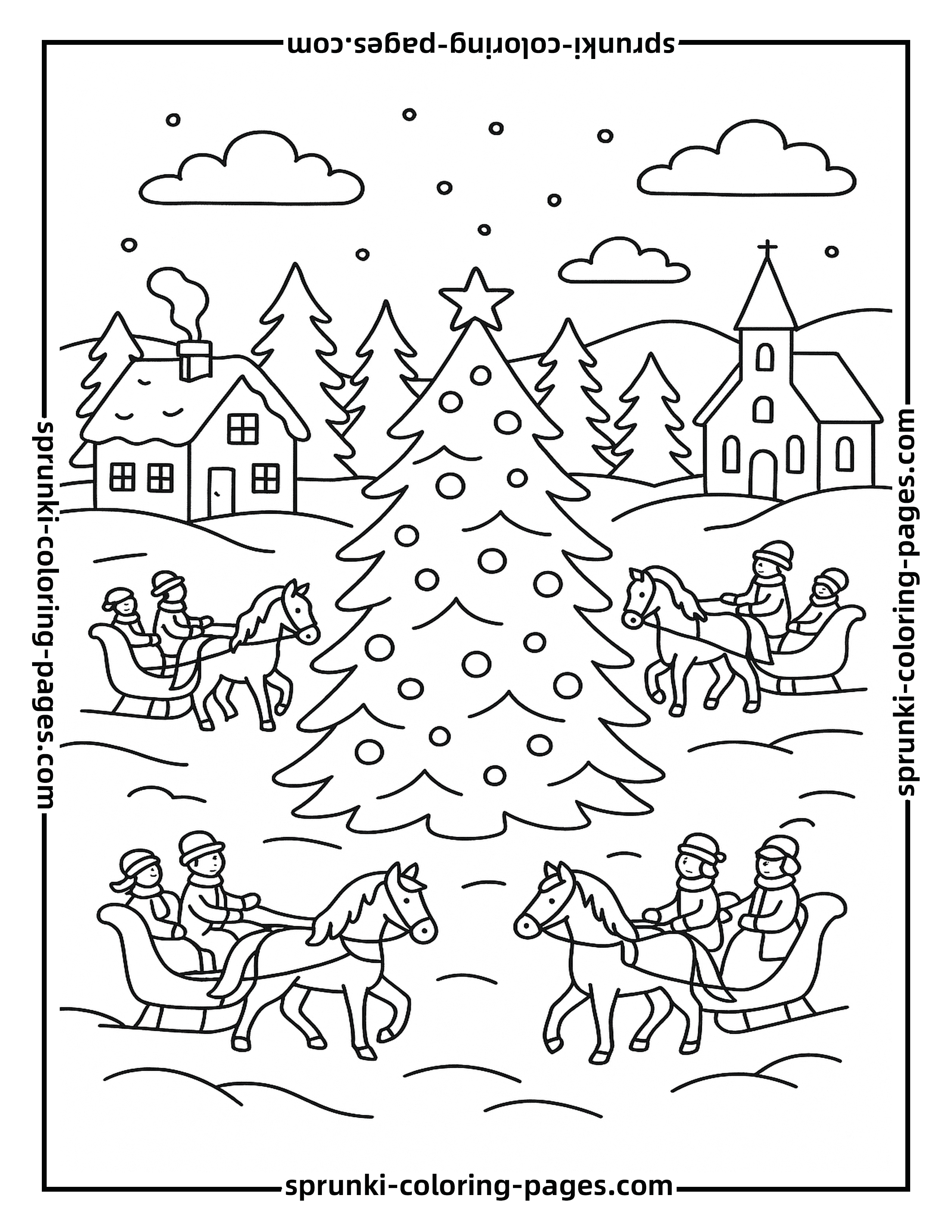 This snowy countryside Christmas tree coloring page features horse-drawn sleighs and a central decorated tree, offering a nostalgic holiday scene perfect for kids and adults to color. Discover more festive designs in our christmas coloring pages collection and explore a wide selection of Christmas tree coloring pages.