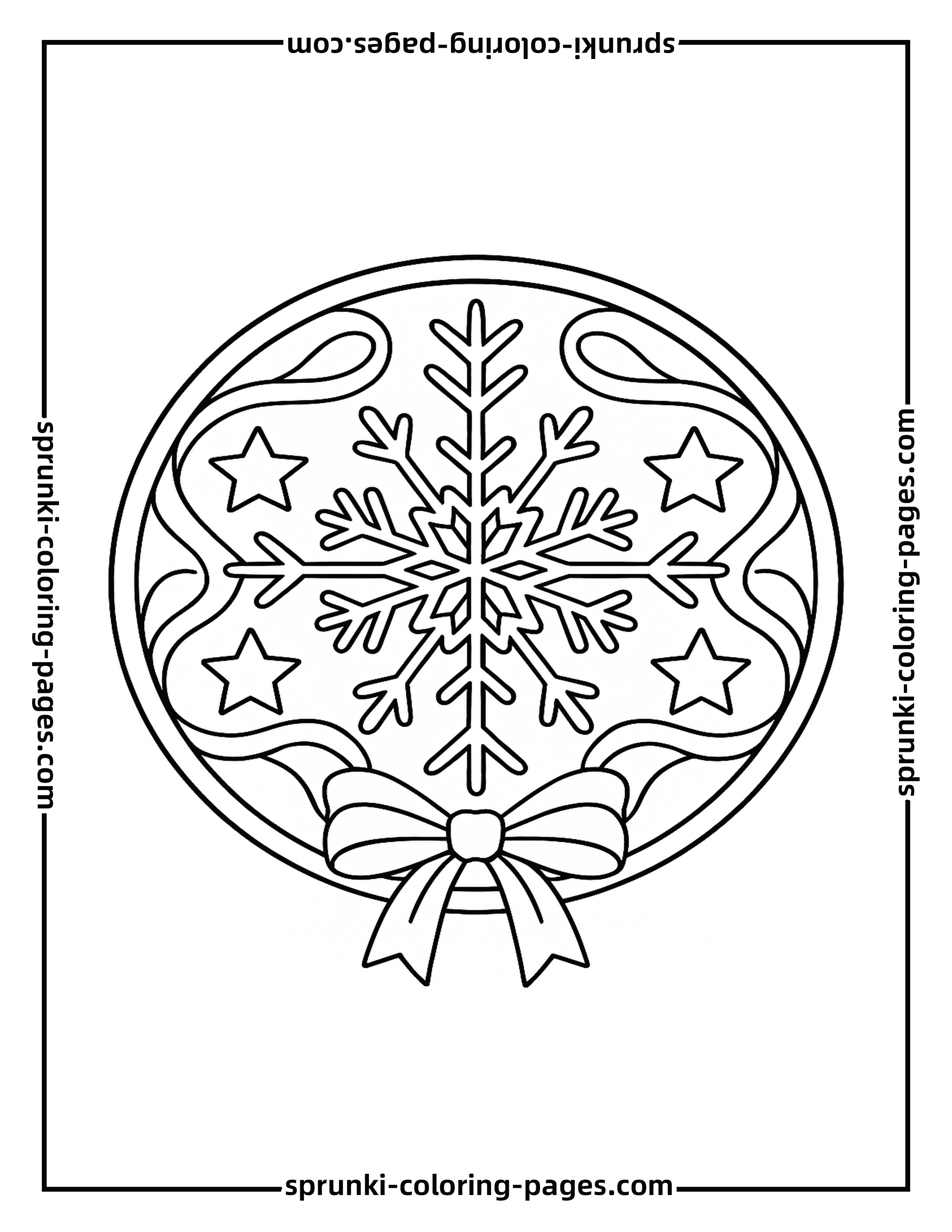 This Christmas Ornament Coloring Page for Adults displays a circular ornament with symmetrical snowflake, star, and ribbon patterns, ideal for festive christmas coloring pages.