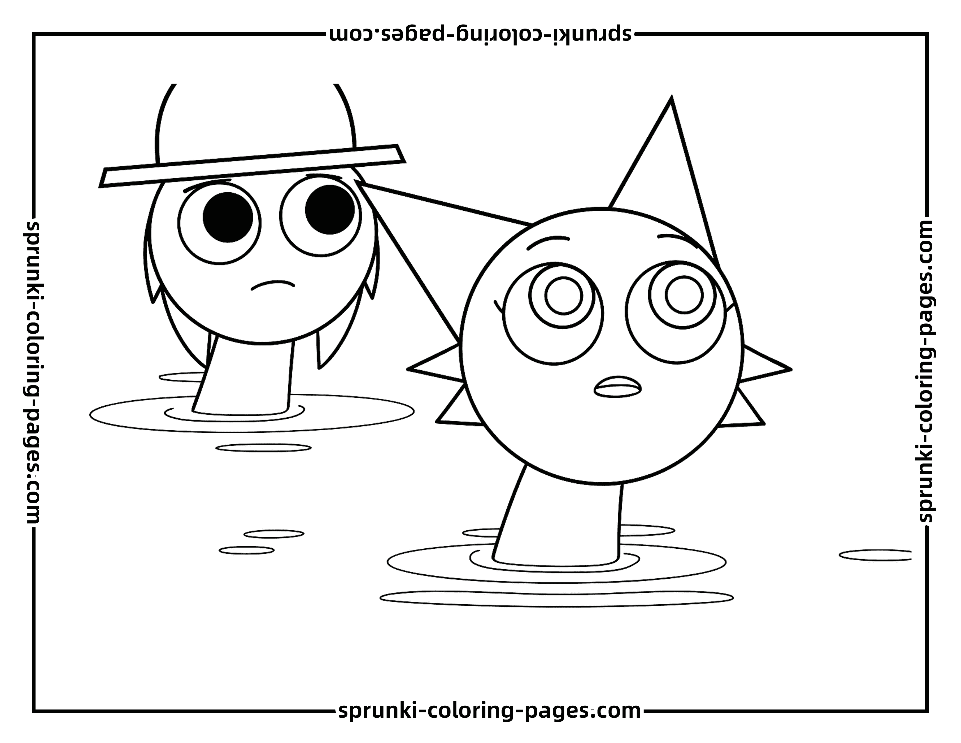 In this Wenda Sprunki coloring page, Wenda and Tunner are caught in a dizzying moment as they struggle in the water. The scene captures their chaotic yet playful situation, perfect for fans who enjoy dynamic, fun-filled scenes from the Sprunki universe. Let your creativity flow as you color this action-packed moment, bringing out the excitement of Wenda's and Tunner's unpredictable adventure. With the splashing water and their dizzy expressions, this page offers a colorful challenge for any fan of the Sprunki characters!
