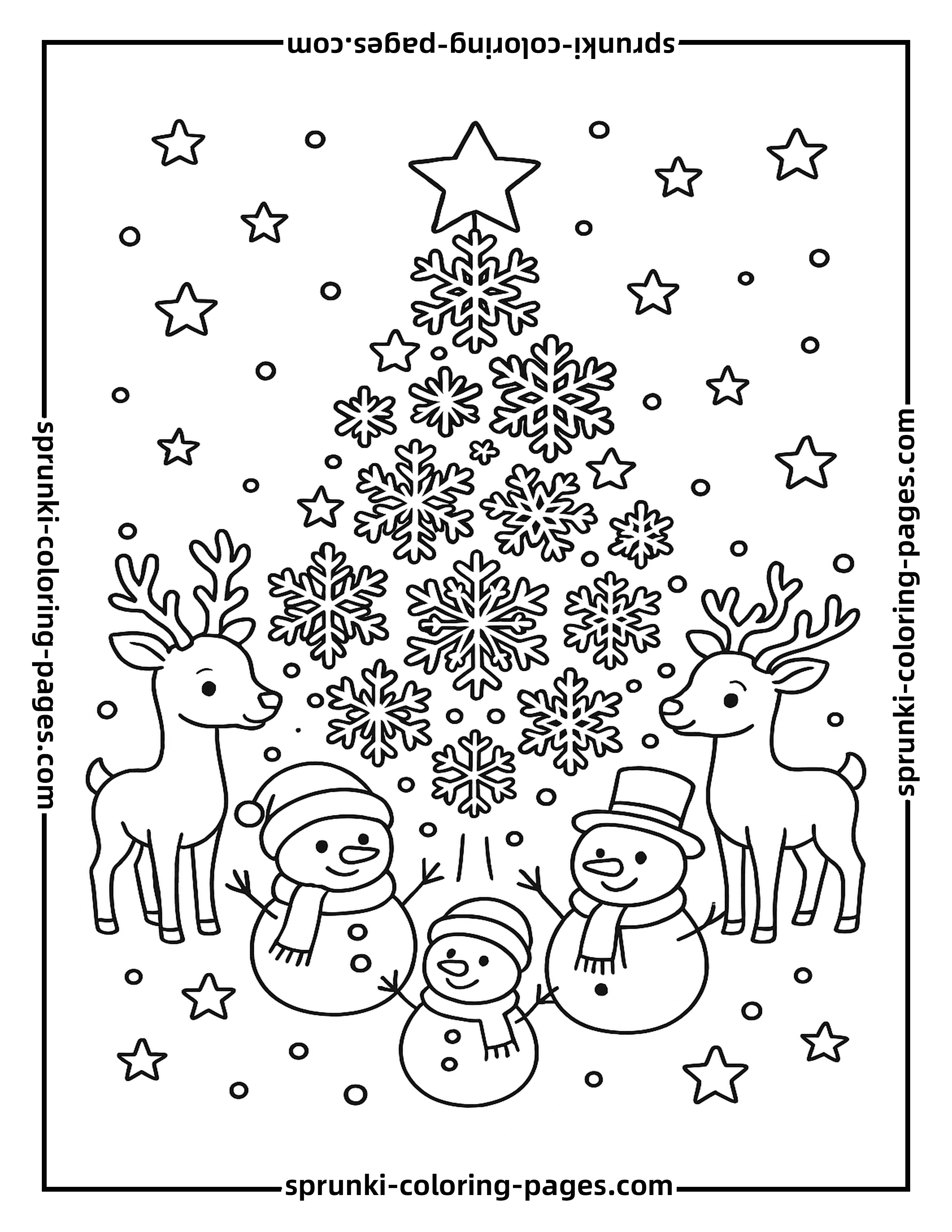 This whimsical Christmas tree coloring page features a magical tree made of snowflakes and stars, surrounded by playful reindeer and snowmen. Kids and adults can enjoy this imaginative winter scene while coloring their favorite festive designs. Explore more holiday inspiration in our christmas coloring pages collection with a variety of creative Christmas tree coloring pages.